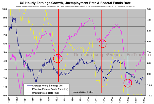 На приведенном графике видно, что после достижения уровнем безработицы максимального значения он начинает снижаться. В какой-то момент зарплаты начинают расти, и тогда ФРС поднимает процентные ставки, чтобы контролировать инфляцию. Обратите внимание на то, что ось координат y, обозначающая безработицу, перевернута для более удобного сопоставления движений. К настоящему моменту уровень безработицы непрерывно снижается с 2010 года, в то время как рост зарплат начался в 2013 году, и хотя сейчас показатель находится на низких уровнях, первое повышение процентной ставки с момента установления кризисных минимумов в 2009 году уже не за горами. Советую также прочитать статью в газете The Washington Post.