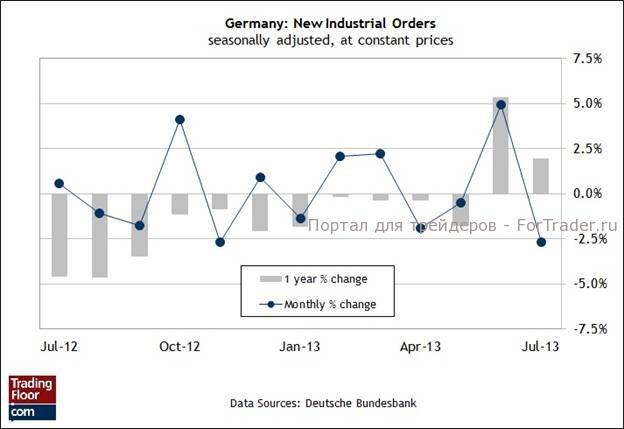 Германия остается лидером по темпам роста в Еврозоне, но в июле произошла небольшая заминка, когда новые промышленные заказы неожиданно сократились сильнее, чем ожидалось. Некоторые аналитики предупредили, что падение заводских заказов на 2,7% является признаком замедления развития крупнейшей экономики Европы. Другие считают, что спад в июле представлял собой коррекцию после существенного прироста новых заказов в июне. «В предыдущем месяце был зафиксирован значительный прирост. Такие высокие темпы не могут быть постоянными, даже если общий прогноз положительный», — заявил экономист из Deutsche Postbank после публикации отчета в прошлом месяце. — «Темпы роста экономики Германии на самом деле довольно стабильные».