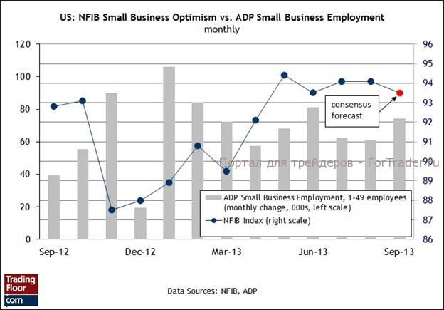 Поэтому неудивительно, что экономисты ожидают небольшого снижения уровня оптимизма в сфере малого бизнеса в сегодняшнем отчете Национальной федерации независимых компаний (National Federation of Independent Business — NFIB) за сентябрь. Консенсус-прогноз предусматривает откат к отметке 93,5 по сравнению с 94 в августе. Если прогноз сбудется, то потери будут минимальными. В то же время, учитывая накопившиеся в этом месяце проблемы в связи с бюджетными разногласиями в Вашингтоне, даже относительно благоприятный результат за сентябрь может быстро отойти на задний план, когда появится статистика за октябрь.