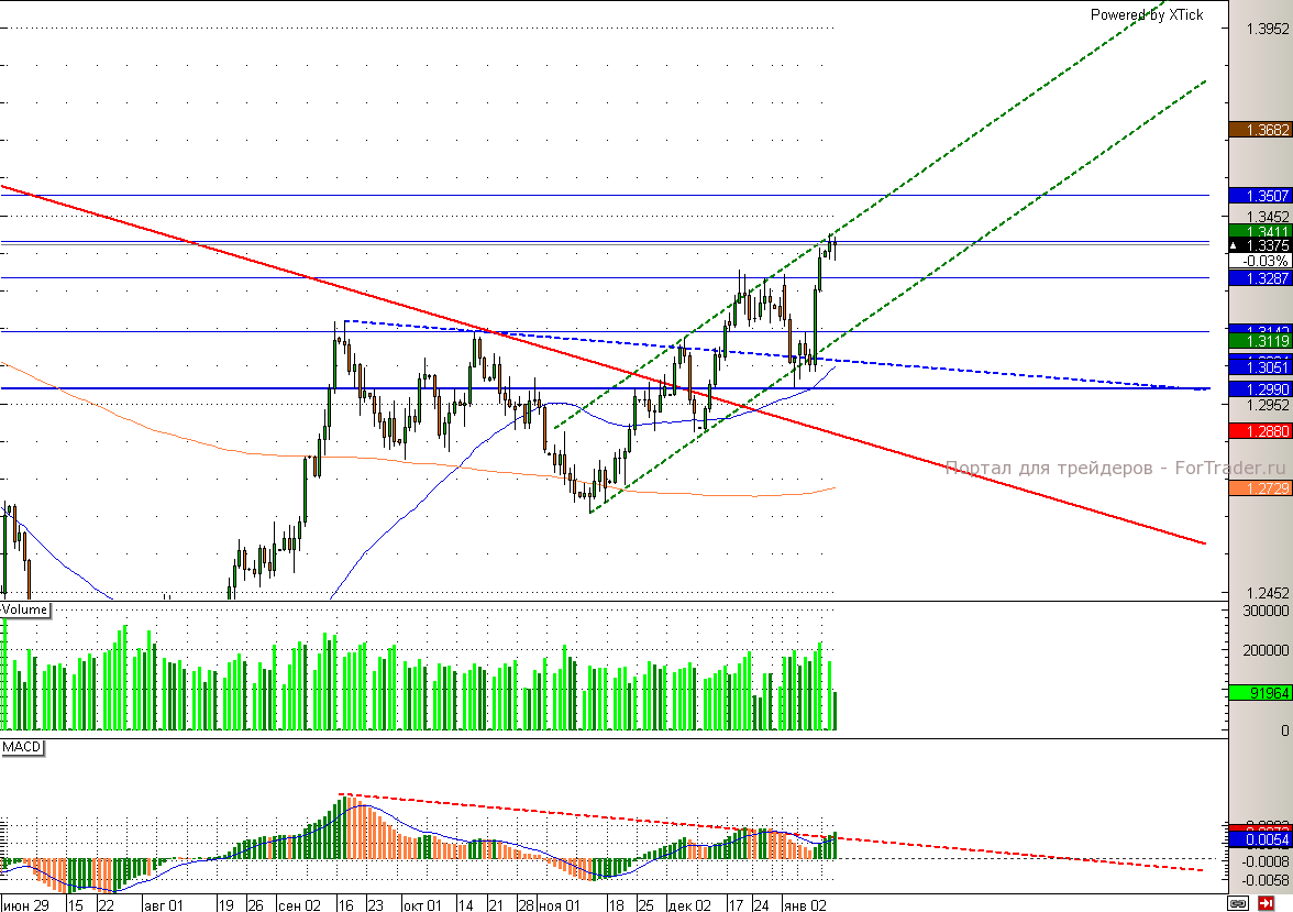 Европейская валюта так и не смогла преодолеть верхнюю границу канала и, теперь, первой целью для отскока станет 1,329. Между тем статистика Еврозоны не добавляет оптимизма валюте региона. Еще вчера промышленное производство Италии (-1%) и Еврозоны (-0,3%) показало в ноябре значительное ухудшение по сравнению с предыдущим месяцем. Слабость доллара к евро по-прежнему обусловлена лишь мягкой денежно-кредитной политикой США.