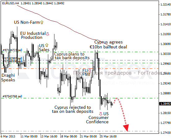 После резкого снижения в понедельник, EUR/USD продолжает корректироваться. Вместе с тем, негативный фон в еврозоне все ещё превалирует, а потому уже в скором времени медведи могут вернуться на рынок. Последние решения по Кипру, согласно которым депозиты крупных вкладчиков замораживаются, а в дальнейшем по ним возможны прямые убытки до 40%, подорвали и без того слабое доверие к европейским властям. Интересно, как после всего этого будут проходить переговоры по банковскому союзу и единой системе страхования вкладов.