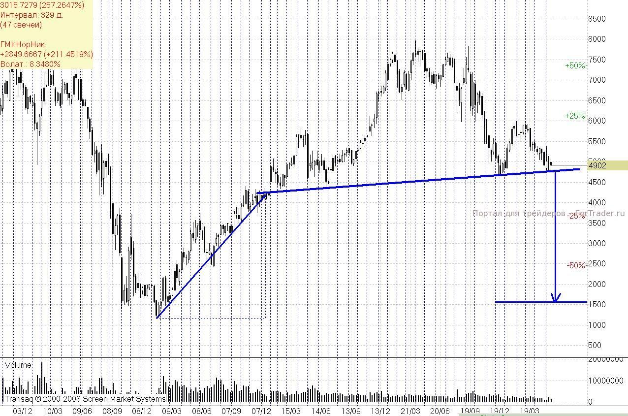 Пример такой опасной фантазии представил мне тот же трейдер, что напомнил мне про «страшную» «голову-плечи» на ГМК «Норильский никель».