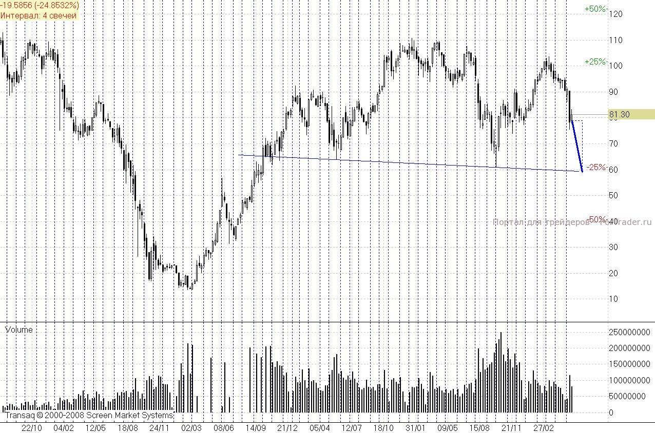 Так что эту особенность мы не будем воспринимать как препятствие для отработки фигуры вниз. Есть более серьезный повод усомниться в разворотной силе фигуры. Дело в том, что тренд до начала образования фигуры длился 11 месяцев, а сама фигура рождалась более трех лет. Для тех, кто смотрит на классические азы соотношения периода формирования тренда и самой фигуры – это знак того, что фигура не исполнится или исполнится лишь частично. На практике для российских бумаг время формирования тренда мало играет роль – главное его сила. А нашей фигуре есть что развернуть – это тренд, вознесший котировки почти на 260%.