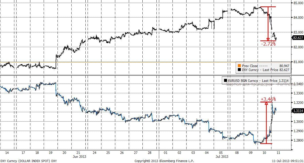 Бен Бернанке успокоил инвесторов. Американский доллар мгновенно отыграл эту событие резким падением. За неполных два дня индекс доллара потерял 2,72%, что является довольно сильной волатильностью для валютного рынка. Евро/доллар напротив укрепился более чем на 3,46%, преодолев почти 4 «фигуры». Судя по всему, пришло время рисковых активов.