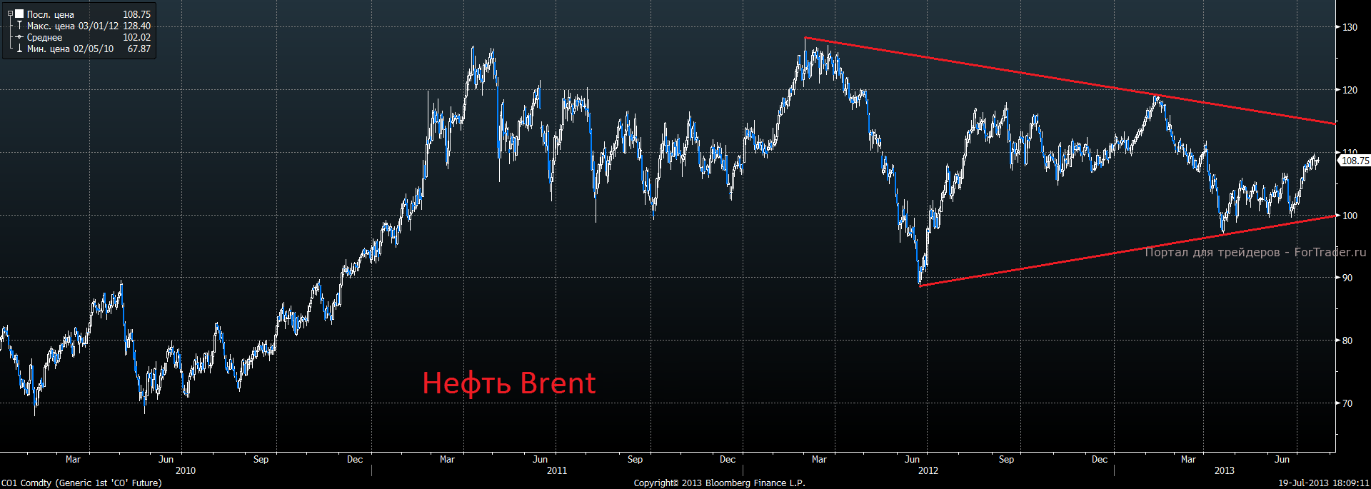 Неплохо накануне смотрелся рынок сырья. Цены на драгоценные и промышленные металлы были в лидерах роста. Сегодня здесь пока всё без изменений. Цены на нефть стабильны в районе 108 долларов за баррель и находятся ровно по середине торгового диапазона. Уровень сопротивление по нефти марки brent, находится на отметке 115, а уровень поддержки на отметке 100.