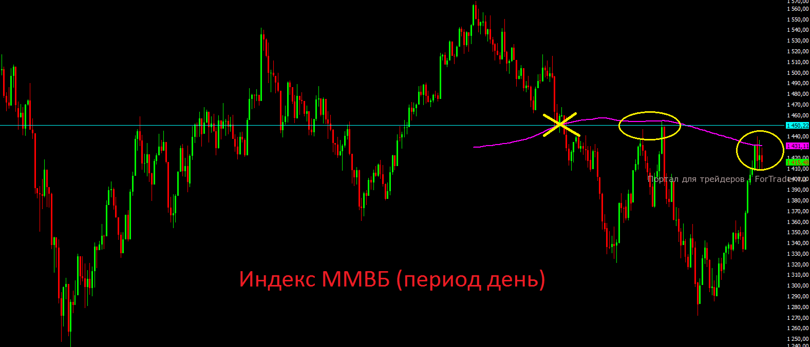 Сегодня внешний фон для российских площадок явно позитивный и возможно мы увидим рост в пределах 0.7-1% по основным индексам, но забегать инвесторам в уходящий поезд мы не рекомендуем. Не стоит забывать, что быстро рынки не разворачиваются, на это уходит 1-2 недели. Существенного потенциала роста ни на американских, ни на российских площадках уже нет. Рисковать из-за роста в 2-3% явно не стоит. С технической точки зрения прекрасно видно, как индекс ММВБ уже три дня консолидируется вблизи 200-дневной скользящей средней и чем дольше здесь будет топтаться рынок, тем больше намёков на разворот мы получим. Сегодняшний возможный рост более 1% всё равно текущую картину не изменит. Если цена в ближайшие дни не выйдет выше диапазона 1450-1460 пунктов, стоит готовиться к коррекции.