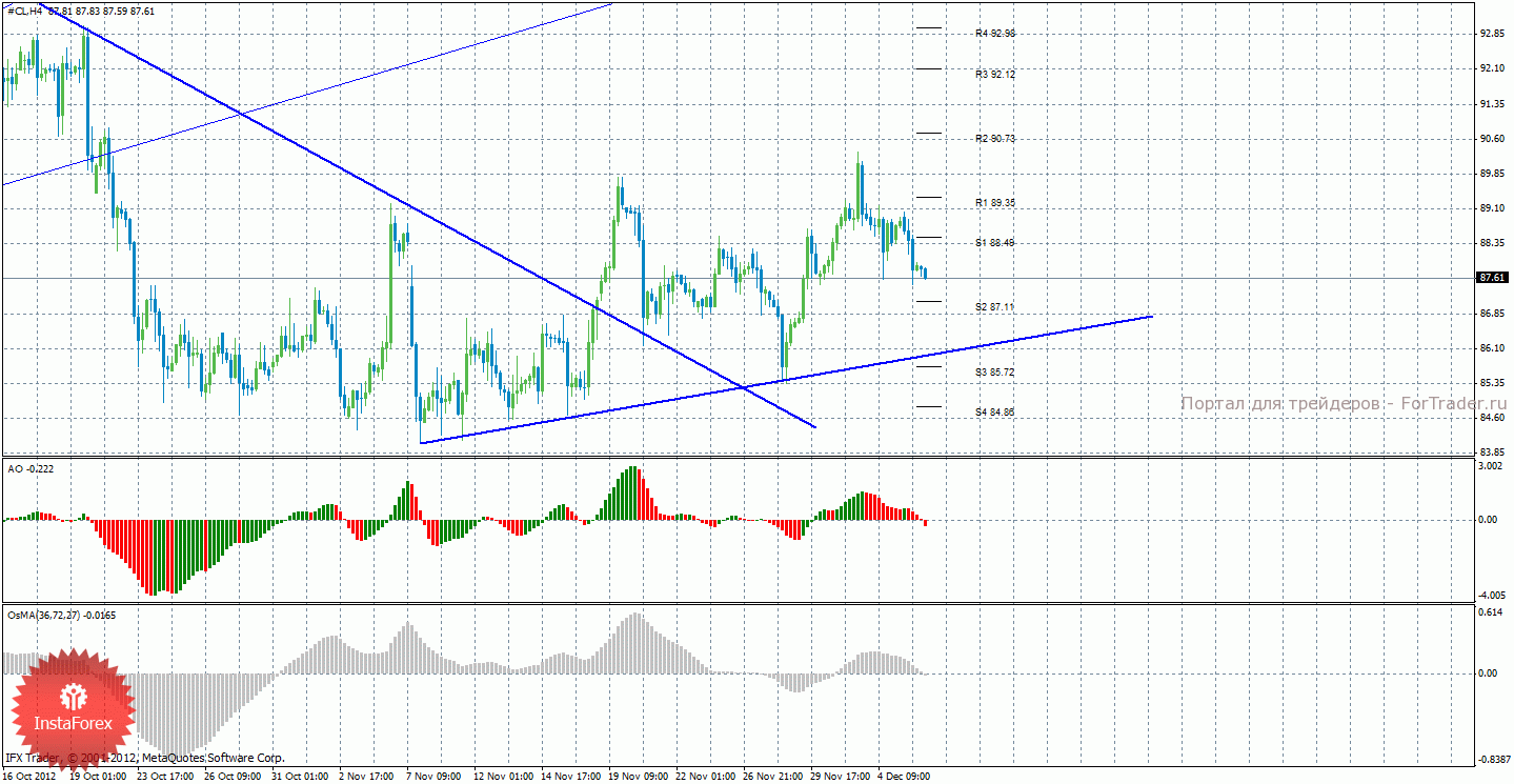 Анализ сырой нефти за 6 декабря показывает, что цена закрепилась ниже уровня поддержки 88,49, чем обозначила продолжение нисходящего коррекционного движения. Новая восходящая линия тренда поддерживает быков и выступает им поддержкой. Таким образом, актуальны длинные позиции с целями S1 – 88,49 и R1 – 89,35, но только после отскока цены от уровня S2 – 87,11. Также возможно продолжение нисходящего коррекционного движения с целями 87,11 и 85,72. Индикатор Awesome показывает текущее нисходящее движение, так как последний закрытый бар красного цвета. OsMA также направлен вниз, что говорит о нисходящем характере движения и в более долгосрочном плане.