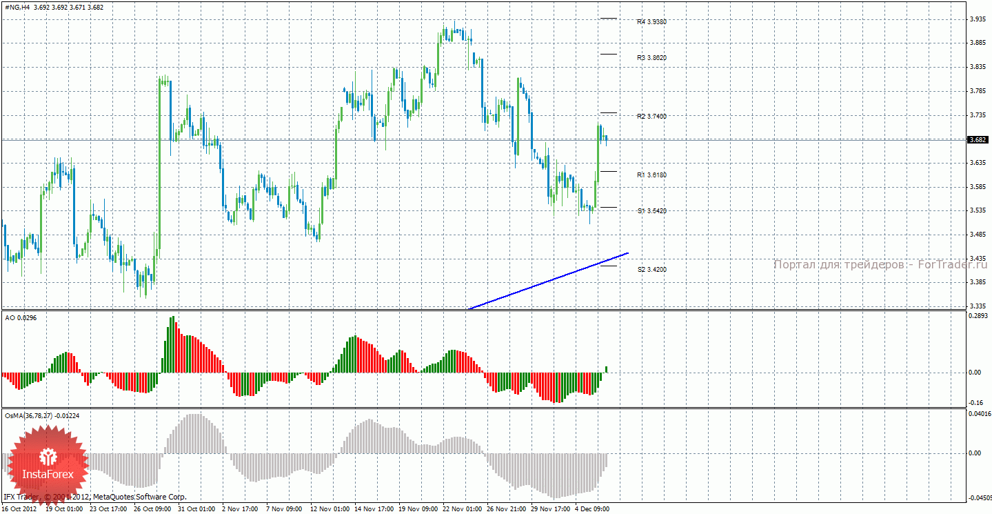 Анализ природного газа за 6 декабря показывает, что вчера завершила нисходящую коррекцию и быстрыми темпами начала восходящее движение, при этом существует большая вероятность возобновления нисходящей коррекции. Cейчас актуально восходящее движение с целями 3,7400 и 3,8620. Целями для коррекции новой коррекции выступают уровни 3,6180 и 3,5420, которую можно будет определить по отскоку от уровня R2 – 3,7400. Восходящая линия тренда по-прежнему поддерживает торгующих на повышение, у нее достаточно малый угол наклона, однако, но и слабой ее по-прежнему назвать нельзя. Индикатор Awesome показывает локальное восходящее движение, последний закрытый бар окрашен в зеленый цвет. OsMA также направлен вверх, что сигнализирует о восходящем движении цены на газ и в более долгосрочной перспективе.