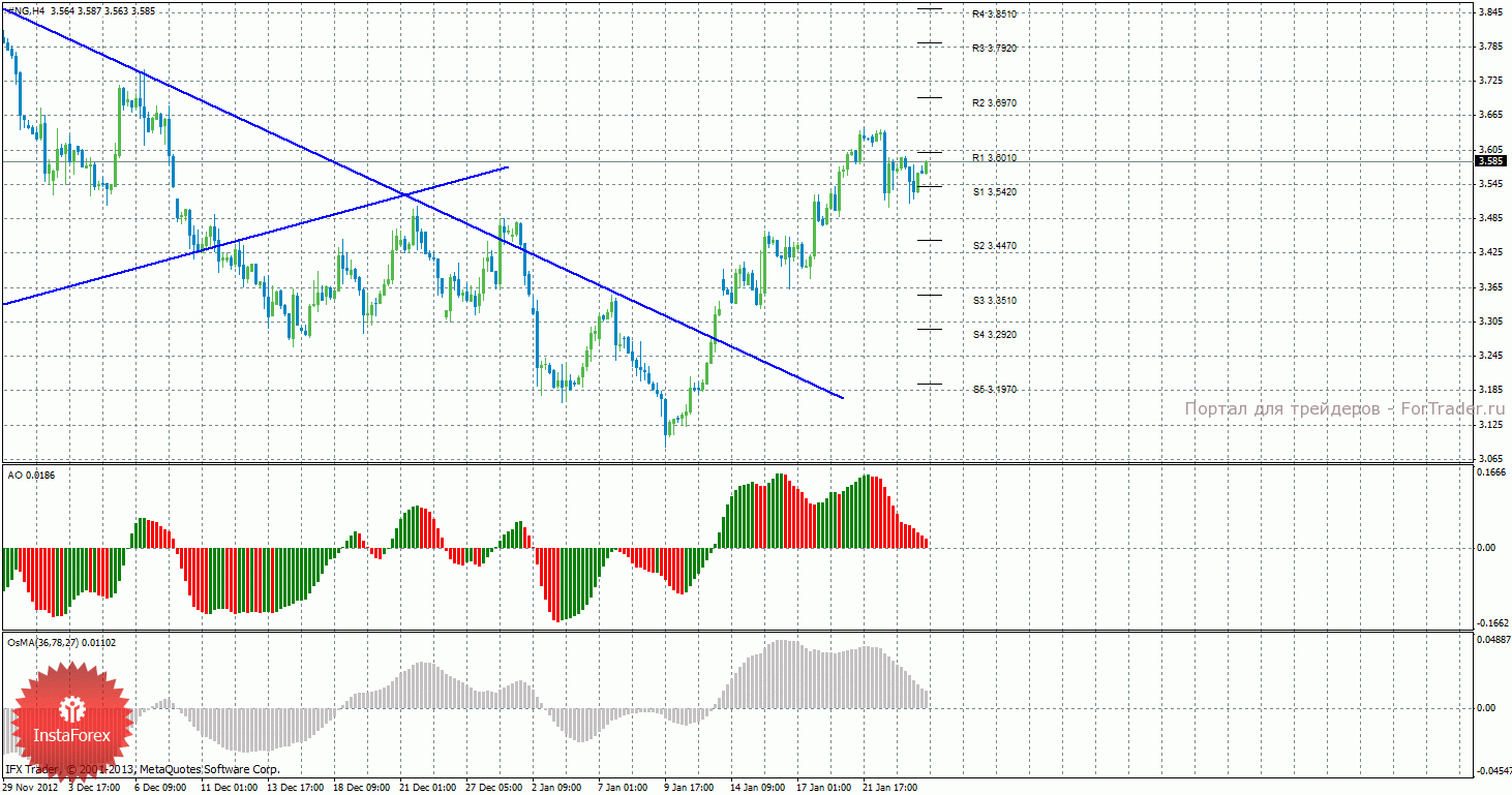 Анализ природного газа за 24 января показывает, что цена продолжает находиться между уровнями S1 и R1 и сохраняет коррекционные настроения и некоторую неопределенность. Сейчас актуально восходящее движение с целями 3,6970 и 3,7920, но только в случае закрепления цены выше уровня 3,6010. Целями для возможной нисходящей коррекции выступают уровни 3,5420 и 3,4470, если цена останется ниже уровня 3,6010. Нисходящая линия тренда более не поддерживает медведей, а новую восходящую линию тренда построить пока что нельзя. Индикатор Awesome показывает локальное нисходящее движение, последний закрытый бар окрашен в красный цвет. OsMA также развернулся вниз, что сигнализирует о начале нисходящего движения цены на газ и в более долгосрочной перспективе. Если цена закрепиться выше уровня 3,6010, это может спровоцировать возобновление восходящего движения.