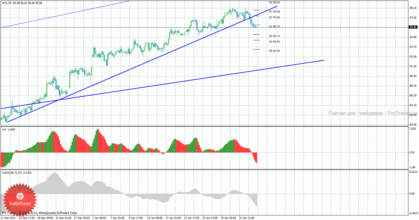 В ходе проведенного анализа движения цены на нефть, можно сделать вывод, что сейчас можно рассматривать короткие позиции с целями 95,14 и 94,50. Стоп-лосс выставляем выше ближайшего уровня сопротивления. При заходе сделки в прибыльность в безубыток. Разворот OsMA или Awesome наверх засвидетельствует возможное начало восходящей коррекции, так же как и закрепление цены выше уровня 96,19. Длинные позиции сейчас рассматривать не рекомендуется.