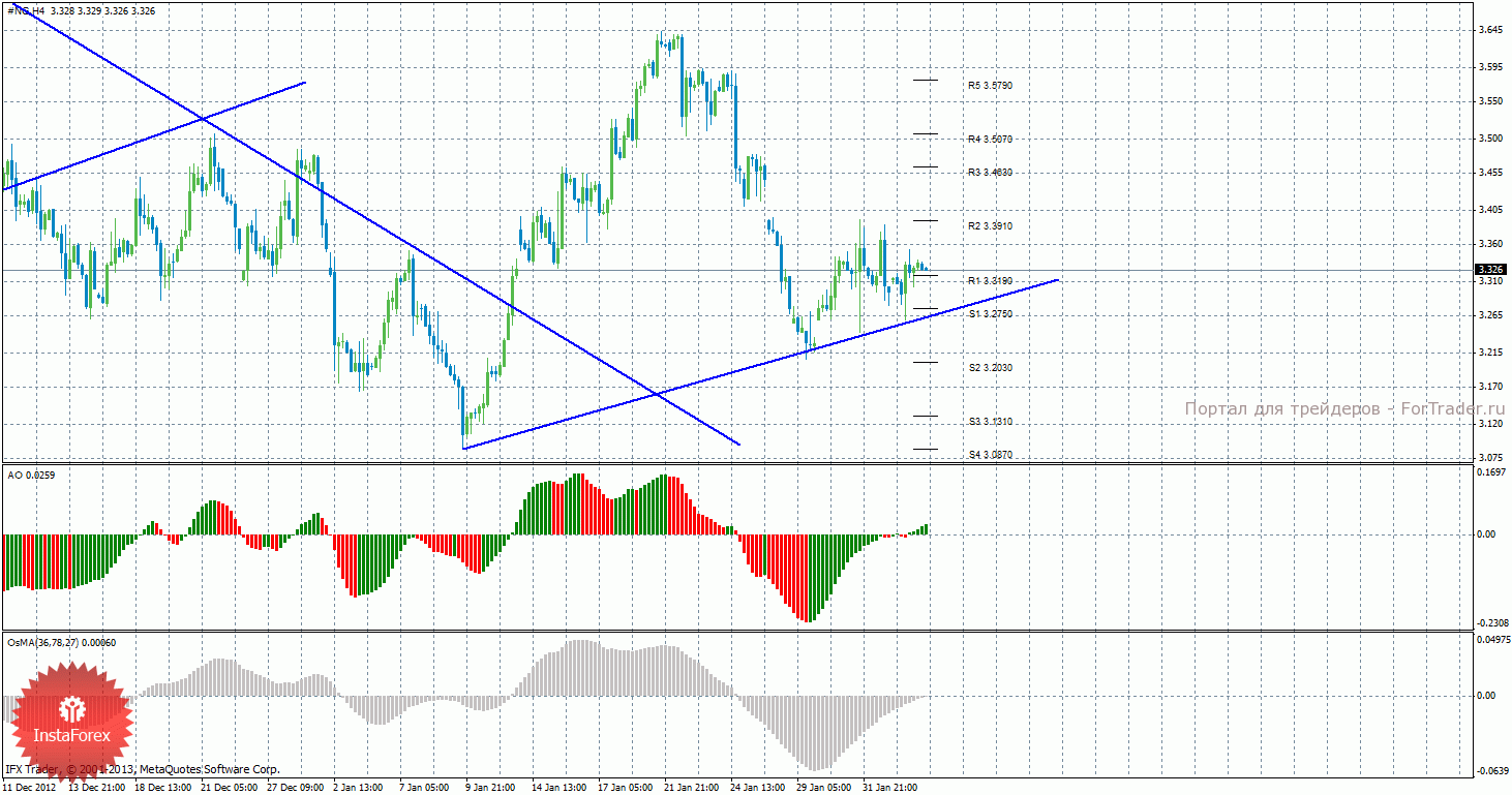 Анализ природного газа за 5 февраля показывает, что цена продолжает восходящее движение, которое поддерживает новая восходящая линия тренда, не слишком сильная. Сейчас по-прежнему актуально восходящее движение с целями 3,3910 и 3,4630, но только в случае нахождения цены выше уровня 3,3190. Целями для возобновления нисходящей коррекции выступают уровни 3,2750 и 3,2030, если цена закрепиться ниже уровня R1 — 3,3190. Новая восходящая линия тренда поддерживает быков, но у нее достаточно малый угол наклона. Индикатор Awesome показывает локальное восходящее движение, последний закрытый бар окрашен в зеленый цвет, поэтому на повышение цены по-прежнему можно рассчитывать. OsMA также направлен наверх, что сигнализирует о продолжении восходящего движения цены на газ и в более долгосрочной перспективе. Если цена закрепиться ниже восходящей линии тренда, это может спровоцировать завершение восходящего тренда.