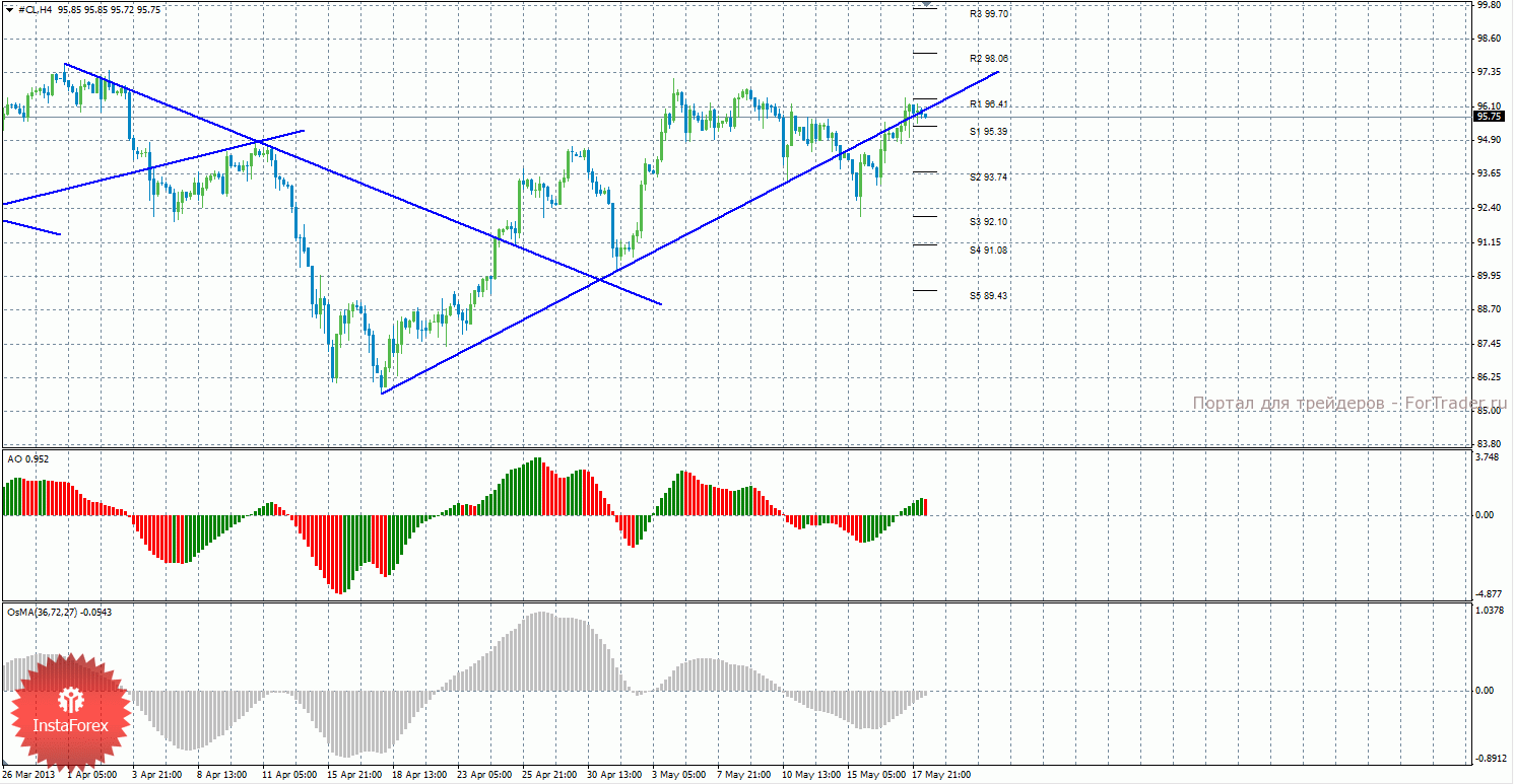 Анализ сырой нефти за 20 мая показывает, что цена продолжает находиться ниже восходящей линии тренда, но при этом продолжает восходящее коррекционное движение и отработала линию тренда снизу. Восходящая линия тренда больше не поддерживает торгующих на повышение, новой нисходящей трендовой линии пока нет. Поэтому на данный момент актуальны короткие позиции с целями S2 – 93,74 и S3 – 92,10, если цена закрепится ниже уровня 95,39. Может также продолжиться восходящая коррекция или даже возобновиться восходящее движение с целями 96,41 и 98,06, если цена останется выше уровня 95,39. Индикатор Awesome показывает текущее восходящее движение, так как последний закрытый бар зеленого цвета. OsMA также направлен наверх, что говорит о восходящем характере движения и в более долгосрочном плане. Если цена закрепится ниже уровня 95,39, это может спровоцировать возобновление нисходящего движения.