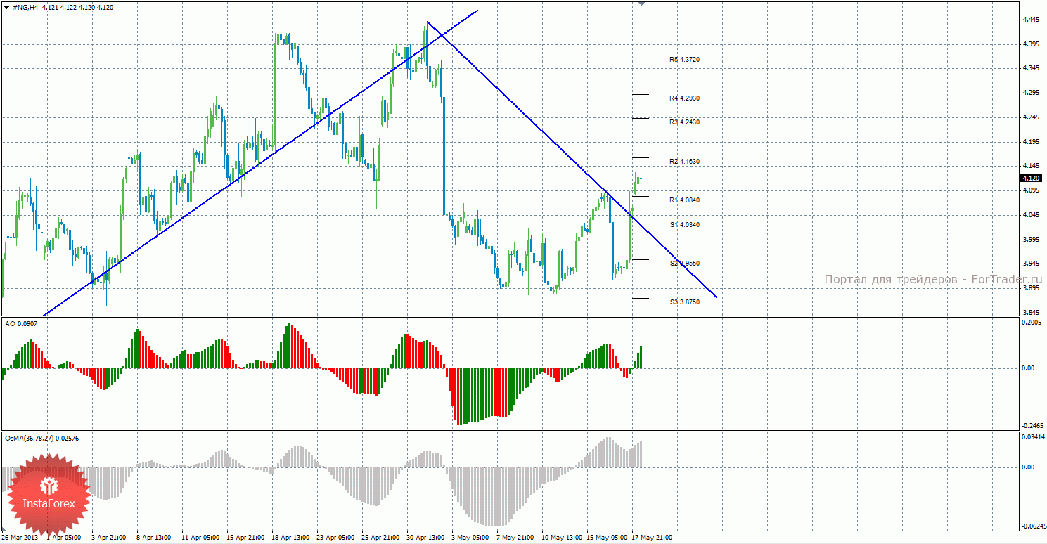 Анализ природного газа за 20 мая показывает, что цена закрепилась выше нисходящей линии тренда и восходящее движение может возобновиться, но пока что это неоднозначный вывод. Сейчас актуально восходящее движение с целями 4,1630 и 4,2430, но следует быть осторожными с лонгами, так как нисходящее движение может возобновиться, а линия тренда перестроится. Целями для возможного возобновления нисходящего движения выступают уровни 4,0340 и 3,9550, но короткие позиции пока что не актуальны. Нисходящая линия тренда больше не оказывает поддержку медведями, но она может перестроится. Индикатор Awesome показывает локальное восходящее движение, последний закрытый бар окрашен в зеленый цвет. OsMA также направлен вверх, что сигнализирует о восходящем движении цены на газ и в более долгосрочной перспективе.