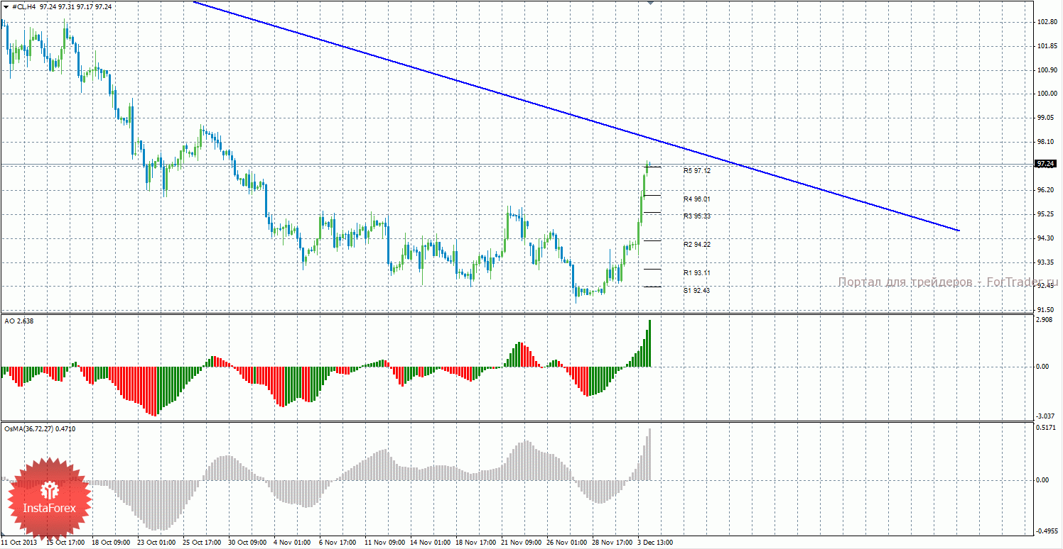 Анализ сырой нефти за 4 декабря показывает, что цена продолжает сильное коррекционное движение и закрепилась выше последнего уровня сопротивления 97,12. Нисходящее движение может возобновиться с целями R4– 96,01 и R3 – 95,33, если цена закрепится ниже уровня 97,12. Может продолжиться восходящая коррекция с целью нисходящая линия тренда, в случае если цена останется выше уровня 94,22. Нисходящая линия тренда сейчас является актуальной и оказывает поддержку торгующим на понижение, но, если цена закрепится выше нее, то тенденция на рынке поменяется на восходящую и станут актуальными длинные позиции. Индикатор Awesome показывает текущее восходящее движение, так как последний закрытый бар зеленого цвета. OsMA также направлен наверх, что говорит о восходящем характере движения и в более долгосрочном плане. Отскок цены от линии тренда может спровоцировать завершение восходящей коррекции.