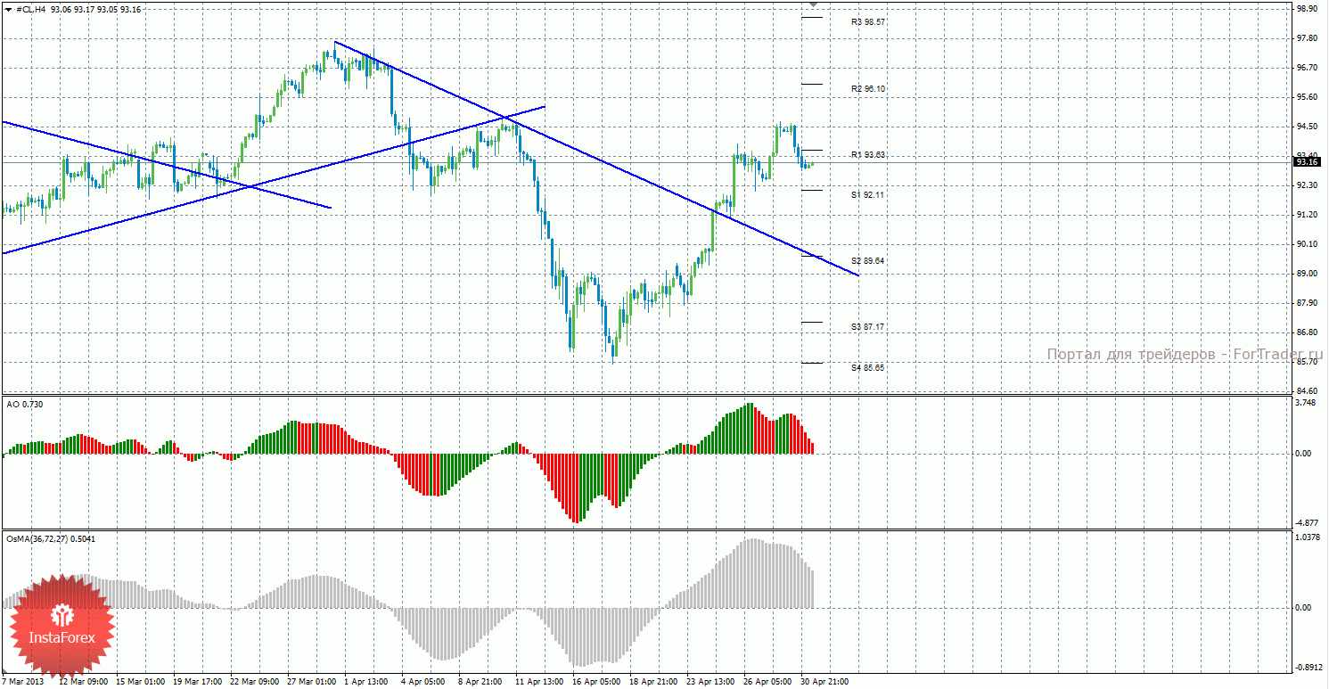 Анализ сырой нефти за 1 мая показывает, что цена вновь начала корректироваться и закрепилась ниже уровня 93,63, оба индикатора также направлены сейчас вниз, сигнализируя о коррекции. Нисходящая линия тренда больше не поддерживает торгующих на понижение, так как цена закрепилась выше нее. Новую восходящую линию тренда построить пока что нельзя. Поэтому на данный момент актуальны длинные позиции с целями R2 – 96,10 и R3 – 98,57, если цена вновь закрепится выше уровня 93,63. Может также продолжиться нисходящее коррекционное движение с целями 92,11 и 89,64. Индикатор Awesome показывает текущее нисходящее движение, так как последний закрытый бар красного цвета. OsMA также направлен вниз, что говорит о нисходящем характере движения и в более долгосрочном плане. Если цена закрепится выше уровня 93,63, это может просигнализировать о завершении коррекционного движения.