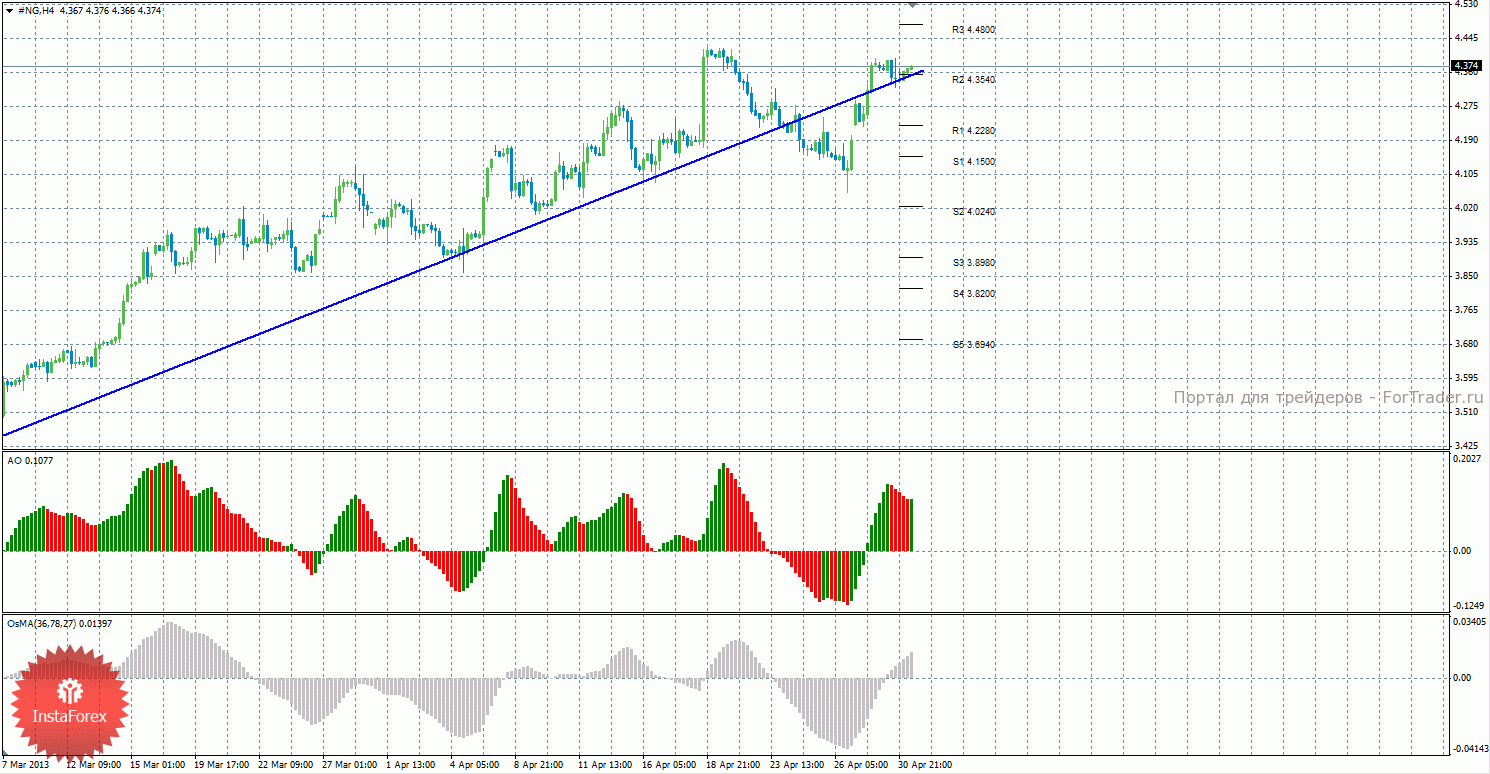Анализ природного газа за 1 мая показывает, что цена закрепилась выше восходящей линии тренда, поэтому сейчас может продолжиться трендовое восходящее движение. Сейчас актуально восходящее движение с целями 4,4800 и 4,5580, если цена останется выше уровня R2 – 4,3540. Целями для возможного начала нисходящей коррекции выступают уровни 4,2280 и 4,1500, если цена закрепится ниже уровня 4,3540. Восходящая линия тренда вновь оказывает поддержку быкам. Индикатор Awesome показывает локальное нисходящее движение, последний закрытый бар окрашен в красный цвет. OsMA же направлен наверх, что сигнализирует о восходящем движении цены на газ в более долгосрочной перспективе. Закрепление цены ниже уровня 4,3540 или ниже восходящей линии тренда может просигнализировать о возможном возобновлении нисходящего движения.