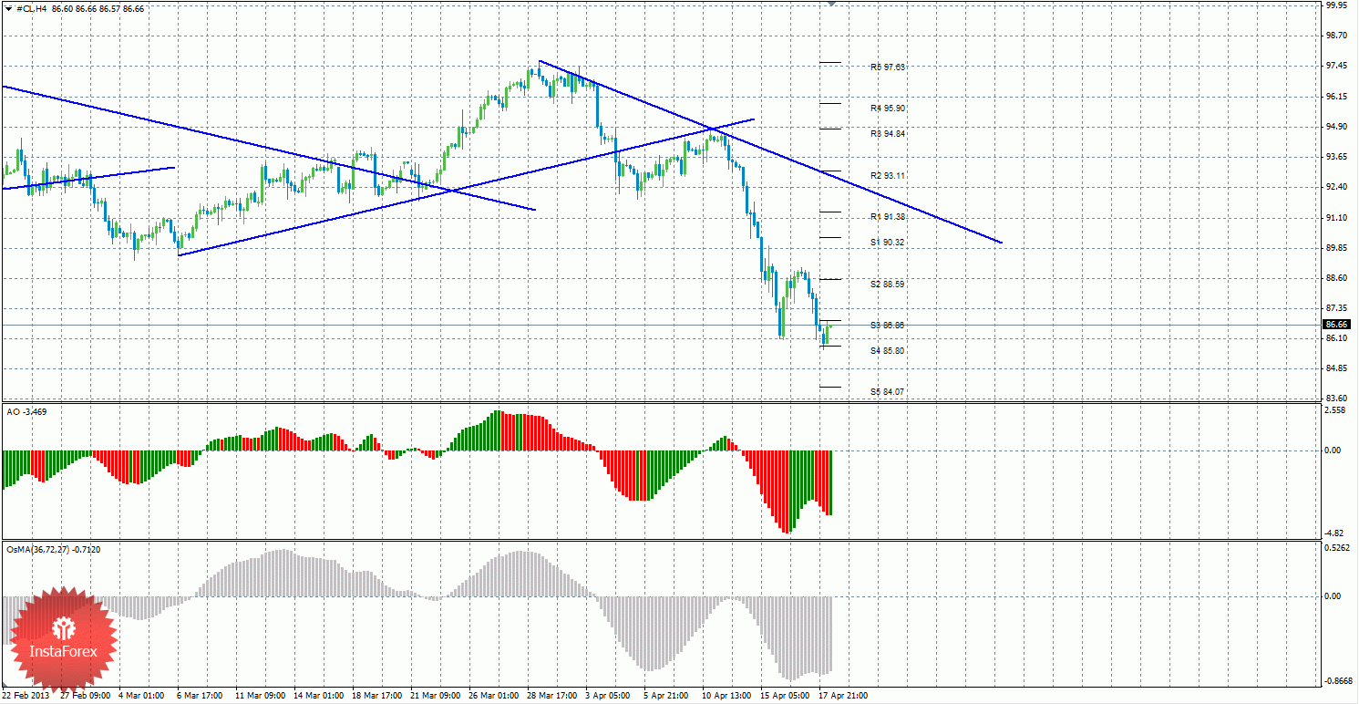 Анализ сырой нефти за 18 апреля показывает, что цена возобновила нисходящее движение и отработала четвертый уровень поддержки, а сейчас может вновь начать корректироваться. Нисходящая линия тренда продолжает поддерживать торгующих на понижение и цена располагается довольно далеко от нее. Поэтому на данный момент актуальны короткие позиции с целями S4 – 85,80 и S5 – 84,07, если цена останется ниже уровня 86,86. Также может начаться восходящее коррекционное движение с целями 88,59 и 90,32, если цена закрепится выше уровня 86,86. Индикатор Awesome показывает текущее нисходящее движение, так как последний закрытый бар красного цвета, что говорит в пользу продолжения нисходящего движения. OsMA же развернулся наверх, что говорит о восходящем характере движения в более долгосрочном плане. Если цена закрепиться ниже уровня 85,80, это может спровоцировать продолжение нисходящего тренда.