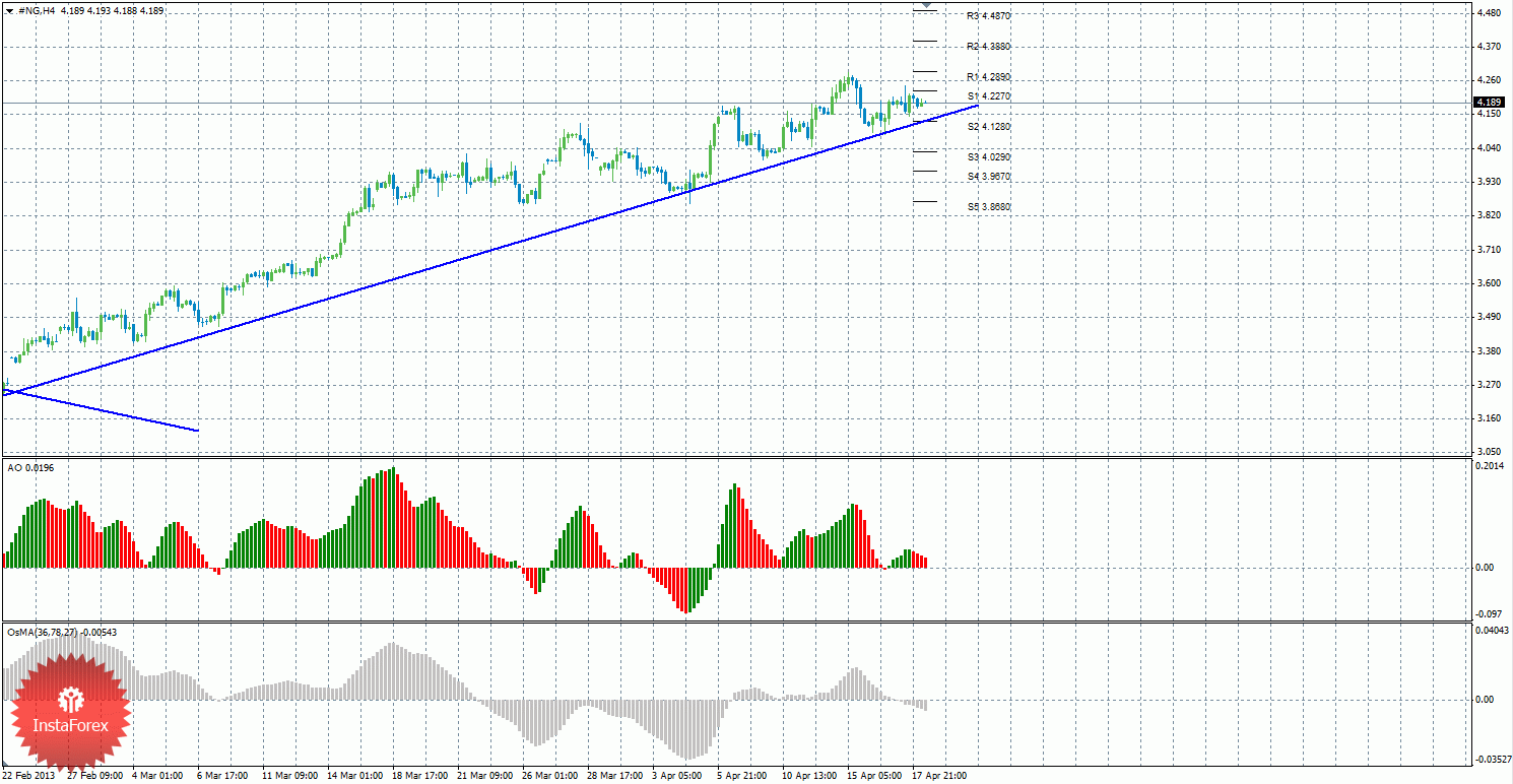 Анализ природного газа за 18 апреля показывает, что цена в который раз не смогла закрепиться ниже восходящей линии тренда и продолжает восходящее движение вдоль этой линии. Сейчас актуально восходящее движение с целями 4,2270 и 4,2890. Целями для возможной нисходящей коррекции выступают уровни 4,1280 и 4,0290, если цена, к примеру, отскочит от уровня сопротивления 4,2270. Восходящая линия тренда оказывает поддержку быкам и не дает цене уйти ниже себя. Индикатор Awesome показывает локальное нисходящее(!) движение, последний закрытый бар окрашен в красный цвет. OsMA также направлен вниз, что сигнализирует о нисходящем движении цены на газ в более долгосрочной перспективе. Если цена закрепится ниже восходящей линии тренда, то на рынке произойдет смена тенденции на нисходящую и станут актуальными короткие позиции с целями 4,0290 и 3,9670. Несмотря на направленность обоих индикаторов вниз, пока цена находится выше линии тренда, восходящее движение продолжается.
