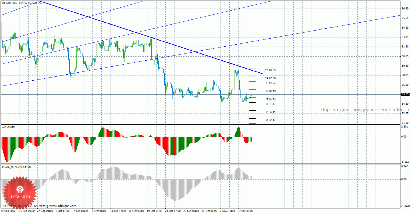 Анализ сырой нефти за 9 ноября показывает, что сейчас актуальны короткие позиции, а цена возобновила нисходящее движение после того, как скорректировалась к нисходящей линии тренда. Нисходящая линия тренда по-прежнему поддерживает торгующих на понижение и пока что выступает поддержкой медведям. Короткие позиции, таким образом, актуальны с целями S1 – 84,50 и S2 – 83,45, но для этого требуется закрепление цены ниже уровня 85,14. Возможно также продолжение коррекционного движения с целями 86,19 и 87,24, так как цена закрепилась выше уровня 85,14. Индикатор Awesome показывает текущее восходящее движение, так как последний закрытый бар зеленого цвета, что как раз указывает на начало коррекции. OsMA же направлен вниз, что говорит о нисходящем характере движения в более долгосрочном плане.