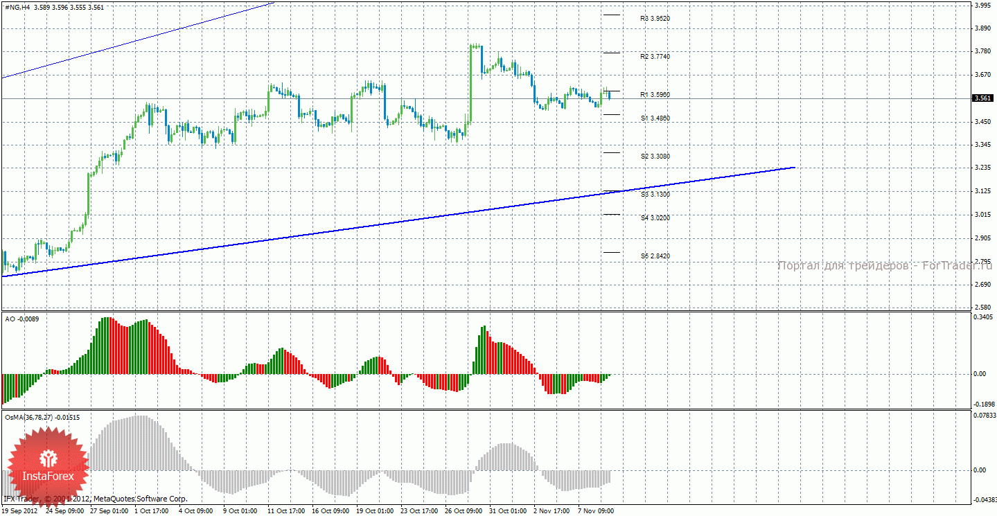 Анализ природного газа за 9 ноября показывает, что цена продолжает находиться между уровнями S1 и R1, что по-прежнему означает неопределенность с направлением движения. Целью для продолжения восходящего движения сейчас выступают уровни 3,7740 и 3,9520, но для их отработки нужно либо закрепление выше уровня 3,5960, либо отскок от уровня 3,4860. В случае не выполнения этих условий может продолжиться нисходящая (боковоая) коррекция с целями 3,4860 и 3,3080. Восходящая линия тренда поддерживает торгующих на повышение, но у нее достаточно малый угол наклона и цена довольно далеко от нее находится, однако, и слабой ее по-прежнему назвать нельзя. Индикатор Awesome показывает локальное восходящее движение, последний закрытый бар окрашен в зеленый цвет. OsMA также направлен вверх, что сигнализирует о восходящем движении цены на газ и в более долгосрочной перспективе, но уровень 3,5960 цена все равно не может преодолеть.