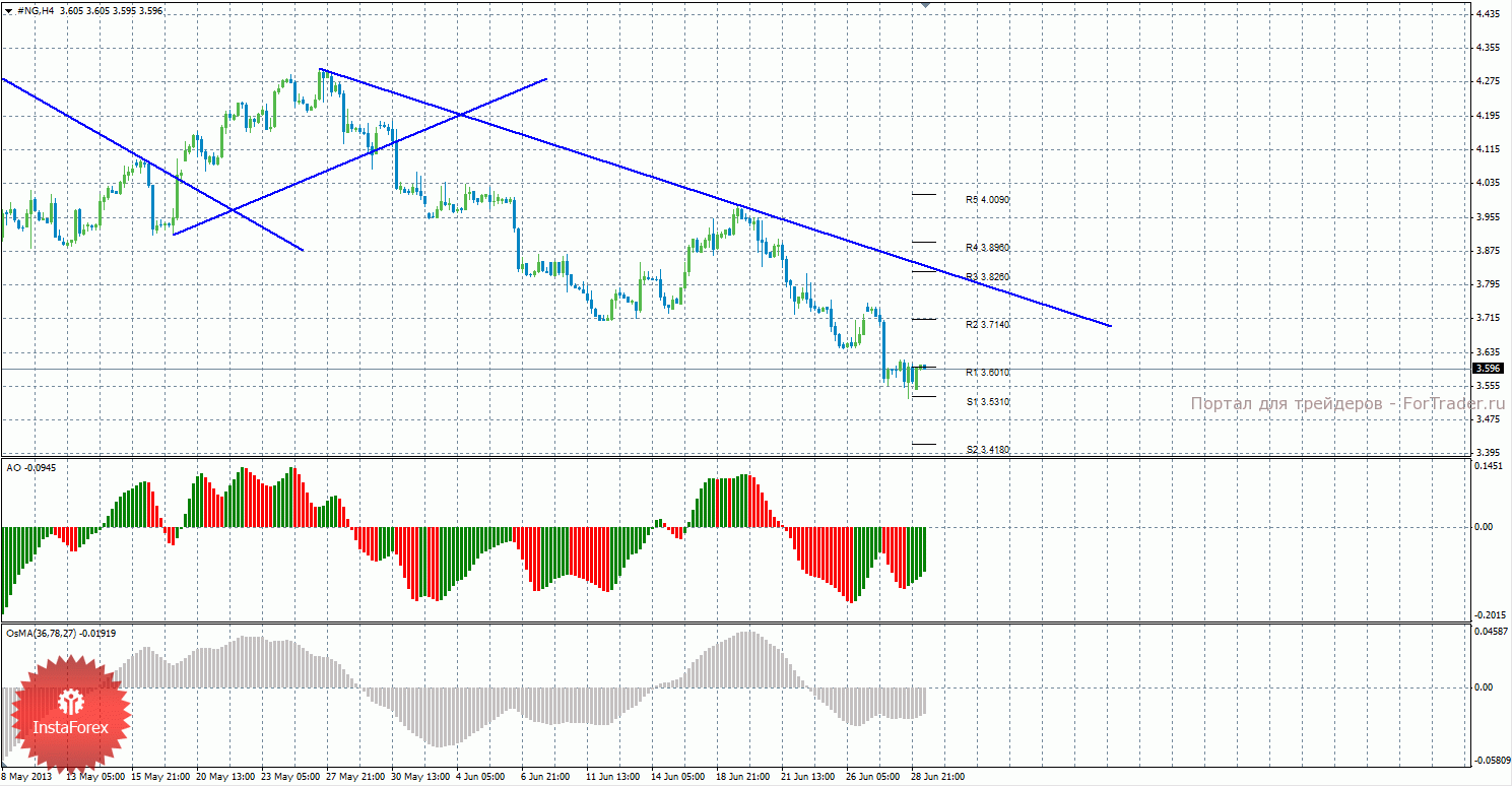Анализ природного газа за 1 июля показывает продолжение нисходящего движения, но и Awesome, и OsMA поменяли направление своего движения на восходящее, что означает возможное начало нового витка коррекции. Сейчас актуально движение вниз с целями уровни поддержки S2 — 3,4180 и S3 — 3,3060, если цена закрепится ниже уровня 3,5310. Целями для возможного начала восходящего коррекционного движения выступают уровни 3,7140 и 3,8260, если цена закрепится выше уровня 3,6010. Нисходящая линия тренда вновь оказывает поддержку торгующим на понижение, так как она перестроена. Индикатор Awesome показывает локальное восходящее движение, последний закрытый бар окрашен в зеленый цвет. OsMA также направлен вверх, что сигнализирует о восходящем движении цены на газ и в более долгосрочной перспективе. Если цена закрепится выше уровня 3,5790, это может стать сигналом к началу нового витка коррекции.