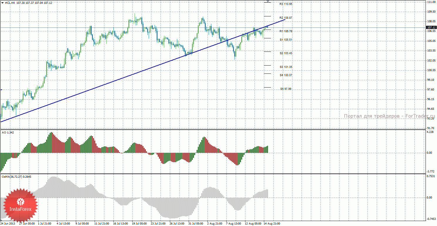Анализ сырой нефти за 15 августа показывает, что цена продолжает находиться ниже линии тренда и также продолжается восходящая коррекция, а цена отработала ту же линию тренда снизу. Сейчас актуальны короткие позиции с целями S1 – 105,51 и S2 – 103,43, если цена закрепится ниже уровня 106,79. Может продолжиться восходящее коррекционное движение с целями 108,87 и 110,97, если цена останется выше 106,79. Восходящая линия тренда больше не оказывает поддержку восходящему движению, нисходящей линии тренда пока что нет. Индикатор Awesome показывает текущее восходящее движение, так как последний закрытый бар зеленого цвета. OsMA также направлен вверх, что говорит о восходящем характере движения и в более долгосрочном плане. Если цена закрепится ниже уровня 106,79, это может спровоцировать возобновление нисходящего движения.