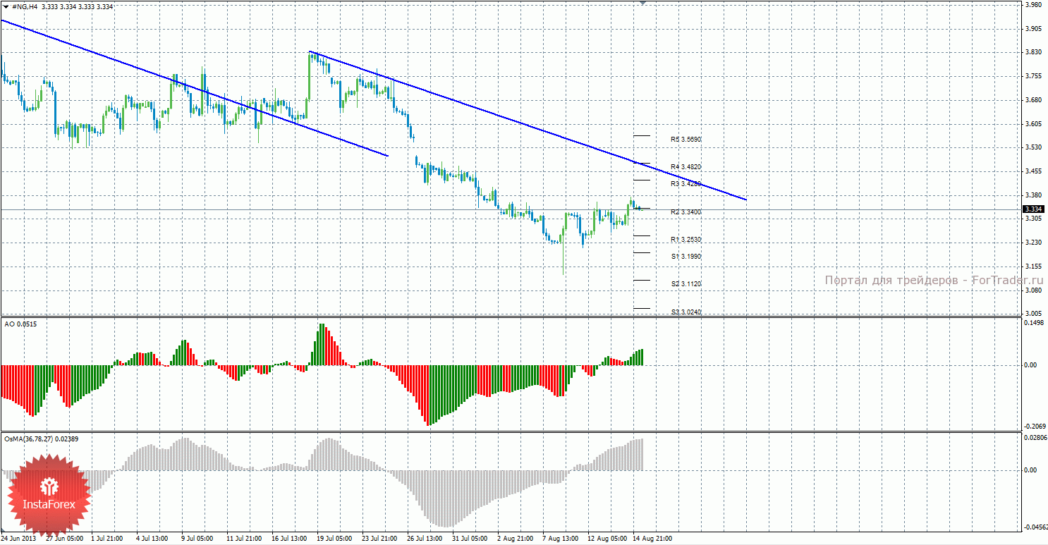 Анализ природного газа за 15 августа показывает, что цена продолжает слабое коррекционное движение, оба индикатора сигнализируют сейчас именно об этом. На данный момент по-прежнему актуально движение вниз с целями уровни поддержки R1 — 3,2530 и S1 — 3,1990, если цена закрепится ниже уровня 3,3400. Целями для возможного продолжения восходящей коррекции выступают уровни 3,4280 и 3,4820, если цена останется выше уровня 3,3400. Новая нисходящая линия тренда продолжает оказывать поддержку торгующим на понижение. Индикатор Awesome показывает локальное восходящее движение, последний закрытый бар окрашен в зеленый цвет. OsMA также направлен вверх, что сигнализирует о восходящем движении цены на газ и в более долгосрочной перспективе. Если цена закрепится ниже уровня 3,3400, то нисходящий тренд может возобновиться.