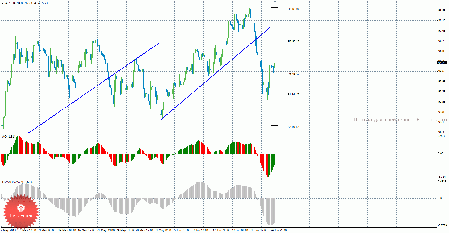 Анализ сырой нефти за 25 июня показывает, что цена продолжает находиться ниже восходящей линии тренда и начала корректироваться после довольно сильного нисходящего движения. Сейчас актуальны короткие позиции с целями S1 – 93,17 и S2 – 90,92, если цена закрепится ниже уровня 94,57. Может продолжиться восходящее коррекционное движение с целями 96,82 и 99,07, если цена останется выше уровня 94,57. Восходящая линия тренда больше не поддерживает торгующих на повышение, так как цена закрепилась ниже нее. Новую нисходящую линию тренда построить на данный момент нельзя. Индикатор Awesome показывает текущее восходящее движение, так как последний закрытый бар зеленого цвета. OsMA также развернулся наверх, что говорит о восходящем характере движения и в более долгосрочном плане. Если цена закрепится ниже уровня R1 – 94,57, это может спровоцировать возобновление нисходящего движения.