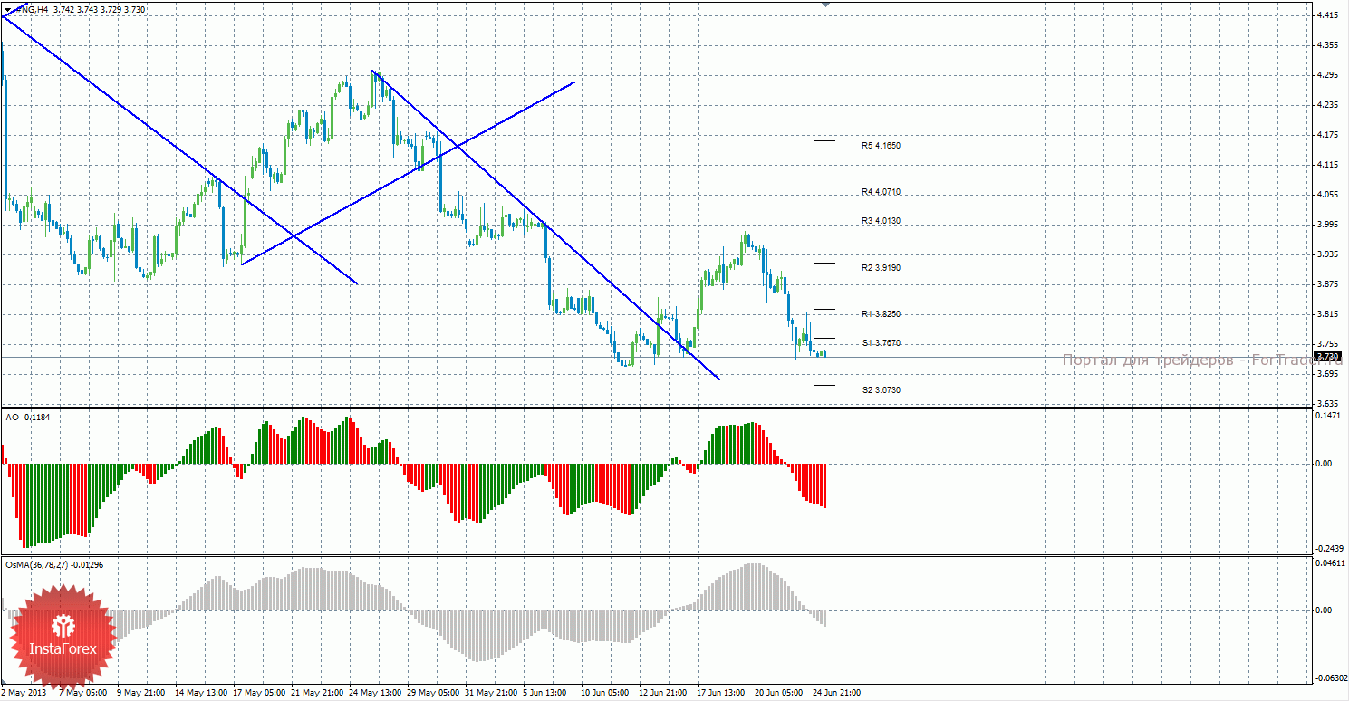 Анализ природного газа за 25 июня показывает, что цена по-прежнему находится выше нисходящей линии тренда и продолжает нисходящее коррекционное движение. Сейчас актуально движение вверх с целями уровни сопротивления R1 — 3,8250 и R2 — 3,9190, если цена закрепится выше уровня 3,7670, ниже которого сейчас находится. Целями для возможного продолжения нисходящего движения выступают уровни 3,6730 и 3,5790, если цена останется ниже уровня S1 — 3,7670. Нисходящая линия тренда больше не оказывает поддержку торгующим на понижение, так как цена закрепилась выше нее. Новую восходящую линию тренда построить пока что нельзя. Индикатор Awesome показывает локальное нисходящее движение, последний закрытый бар окрашен в красный цвет. OsMA также направлен вниз, что сигнализирует о нисходящем движении цены на газ и в более долгосрочной перспективе. Если цена закрепится выше уровня 3,7670, это может стать сигналом к возобновлению восходящего движения.