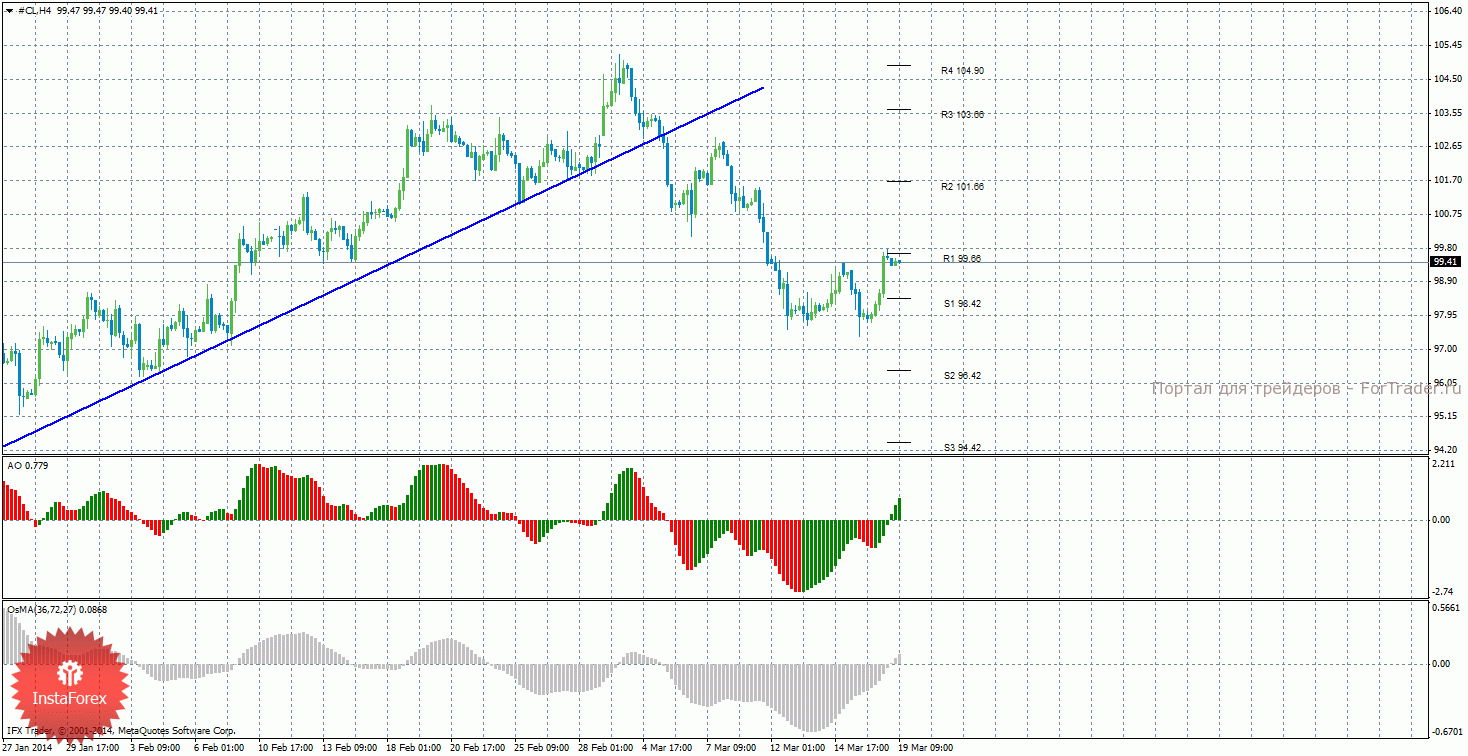 Анализ сырой нефти за 19 марта показывает, что цена начала новый виток коррекции и закрепилась выше уровня S1 – 98,42, оба индикатора направлены наверх. Нисходящее движение может возобновиться с целями S1 – 98,42 и S2 – 96,42, если цена отскочит от уровня 99,66. Может продолжиться восходящая коррекция с целями 101,66 и 103,66, в случае, если цена закрепится выше уровня 99,66. Восходящая линия тренда больше не оказывает поддержку торгующим на повышение, цена располагается ниже нее, поэтому сейчас являются актуальными короткие позиции. Индикатор Awesome показывает текущее восходящее движение, так как последний закрытый бар зеленого цвета. OsMA также направлен наверх, что говорит о восходящем характере движения и в более долгосрочном плане. Если цена отскочит от уровня 99,66, это может засвидетельствовать завершение восходящей коррекции.