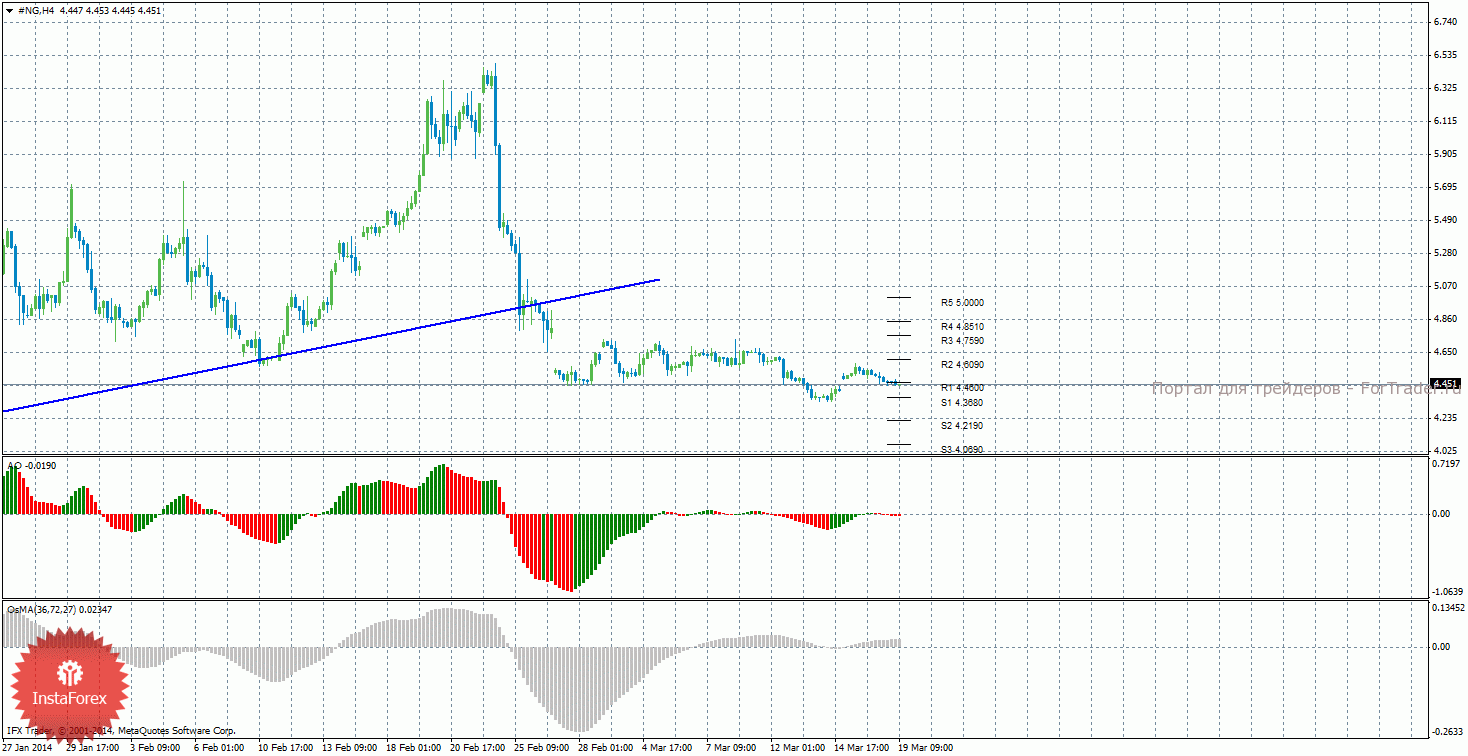 Анализ природного газа за 19 марта показывает, что цена возобновила очень слабое нисходящее движение и располагается чуть выше уровня R1 – 4,4600. На данный момент актуально нисходящее движение с целями уровни поддержки S1 – 4,3680 и S2 – 4,2190, если цена закрепится ниже уровня 4,4600. Целями для возможной восходящей коррекции выступают уровни сопротивления 4,6090 и 4,7590, если цена останется выше уровня 4,4600. Цена закрепилась ниже восходящей линии тренда, поэтому она более не актуальна, тенденция на рынке поменялась на нисходящую. Нисходящей линии тренда пока что нет. Индикатор Awesome показывает локальное нисходящее движение, последний закрытый бар окрашен в красный цвет. OsMA же направлен вверх, что сигнализирует о восходящем движении цены на газ в более долгосрочной перспективе.