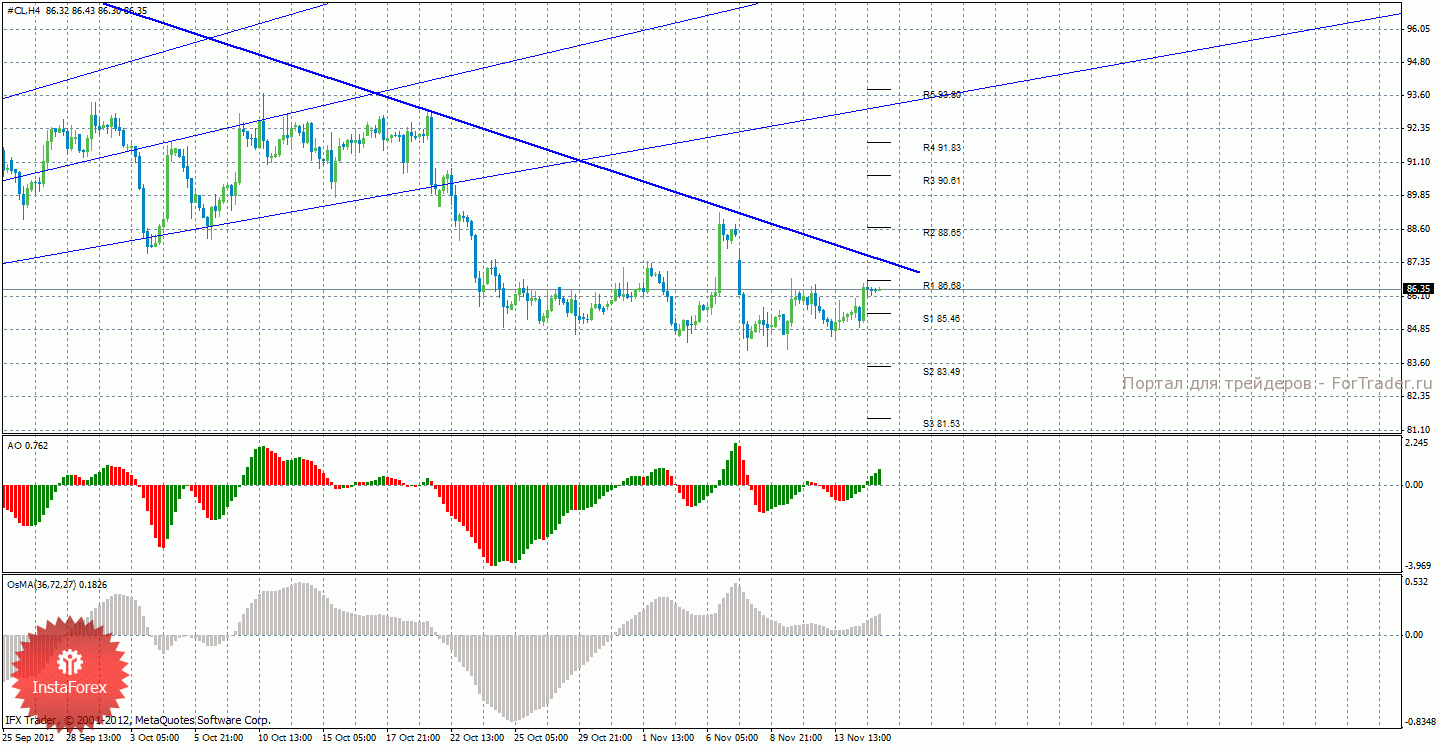 Анализ сырой нефти за 15 ноября показывает, что сейчас актуальны короткие позиции, а цена закрепилась выше уровня S1 – 85,46, что сигнализирует о начале коррекции. Нисходящая линия тренда по-прежнему поддерживает торгующих на понижение и пока что выступает поддержкой медведям. Короткие позиции, таким образом, актуальны с целями S2 – 83,49 и S3 – 81,53, но для возможности их отработки требуется закрепление цены ниже уровня 85,46. Возможно также продолжение коррекционного движения с целями 86,68 и 88,65. Индикатор Awesome показывает текущее восходящее движение, так как последний закрытый бар зеленого цвета, что свидетельствует о продолжении коррекции. OsMA также направлен вверх, что говорит о восходящем характере движения и в более долгосрочном плане.
