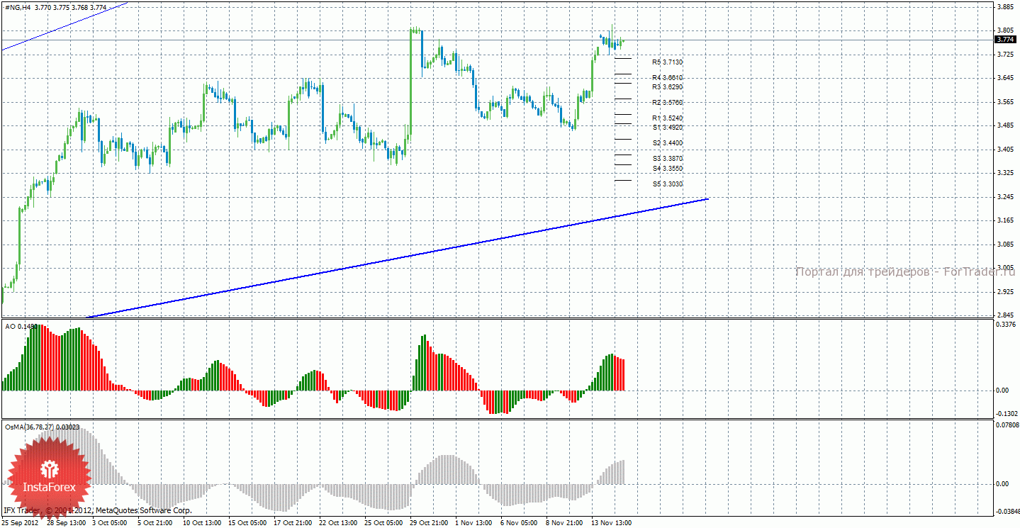 Анализ природного газа за 15 ноября показывает то, что цена закрепилась выше последнего уровня сопротивления R5, поэтому ожидается продолжение восходящего движения. Целей, однако, для торговли на повышение больше нет. Определить начало коррекции можно будет по закреплению цены ниже уровня 3,7130, в этом случае целями для коррекции будут выступать уровни 3,6610 и 3,6290. Восходящая линия тренда поддерживает торгующих на повышение, но у нее достаточно малый угол наклона и цена довольно далеко от нее находится, однако, и слабой ее по-прежнему назвать нельзя. Индикатор Awesome показывает локальное нисходящее движение, последний закрытый бар окрашен в красный цвет, что обозначает нисходящее движение. OsMA же направлен вверх, что сигнализирует о восходящем движении цены на газ в более долгосрочной перспективе.