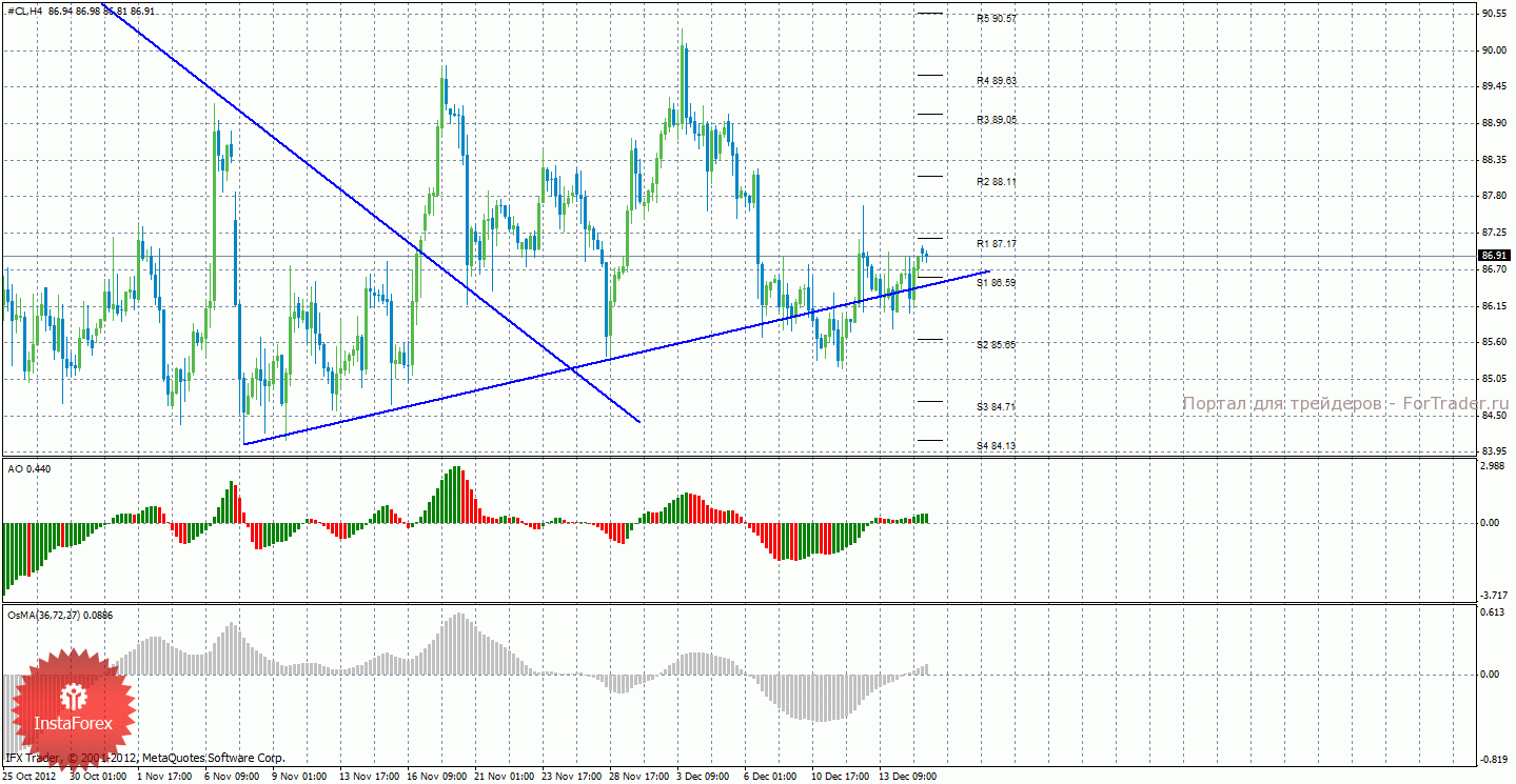 В ходе проведенного анализа движения цены на нефть можно сделать вывод, что сейчас можно рассматривать длинные позиции с целями 88,11 и 89,05 после закрепления выше 87,17. Стоп-лосс выставляем ниже ближайшего уровня поддержки. При заходе сделки в прибыльность в безубыток. Разворот Awesome и OsMA вниз засвидетельствует возможное возобновление нисходящего движения так же, как и закрепление ниже линии тренда. Короткие позиции сейчас рассматривать не рекомендуется.