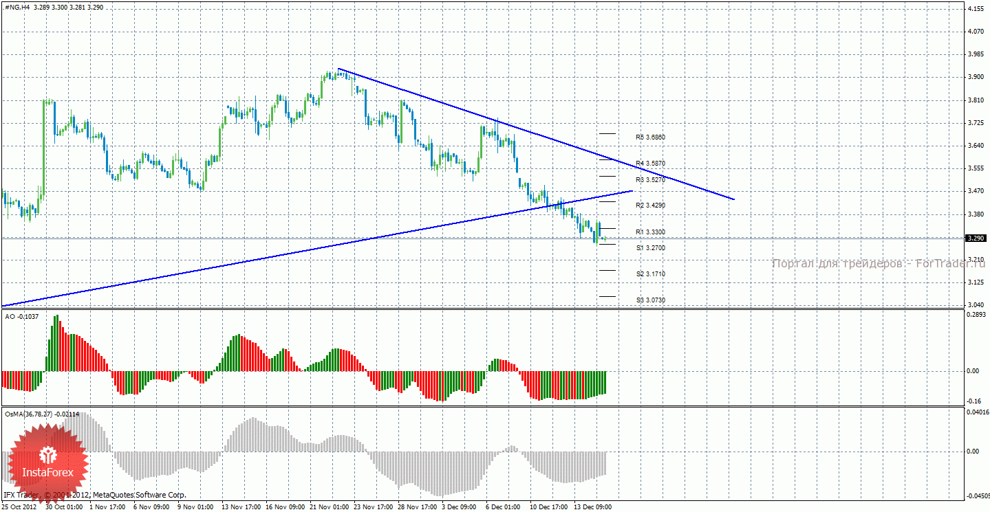 Анализ природного газа за 17 декабря показывает, что цена продолжает нисходящее движение, но на этой неделе пока что находится между уровнями S1 и R1. Cейчас актуально нисходящее движение с целями 3,1710 и 3,0730, но только в случае закрепления ниже уровня поддержки 3,2700. Целями для начала восходящей коррекции выступают уровни 3,4290 и 3,5270, в случае закрепления цены выше уровня 3,3300. Восходящая линия тренда больше не поддерживает торгующих на повышение, так как цена закрепилась ниже нее, зато сформировалась новая нисходящая линия тренда, которая уже оказывает поддержку медведям. Индикатор Awesome показывает локальное восходящее движение, последний закрытый бар окрашен в зеленый цвет, что свидетельствует о возможном начале коррекции. OsMA также направлен вверх, что сигнализирует о восходящем движении цены на газ и в более долгосрочной перспективе, что в сумме с отскоком цены от уровня 3,2700 выглядит весьма логично.