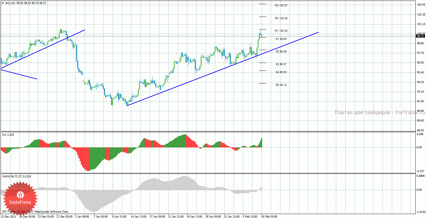 Анализ сырой нефти за 10 февраля показывает, что цена не смогла закрепиться ниже линии тренда и продолжила восходящее движение. Восходящее движение может продолжиться с целями R2 – 102,05 и R3 – 103,57, если цена закрепится выше уровня 100,54. Может начаться нисходящая коррекция с целями 98,09 и 96,57, в случае, если цена закрепится ниже уровня 99,60. Восходящая линия тренда вновь оказывает поддержку торгующим на повышение, цена располагается выше нее. Индикатор Awesome показывает текущее восходящее движение, так как последний закрытый бар зеленого цвета. OsMA также направлен вверх, что говорит о восходящем характере движения и в более долгосрочном плане. Если цена закрепится выше уровня 99,60, это может засвидетельствовать виток коррекционного движения.