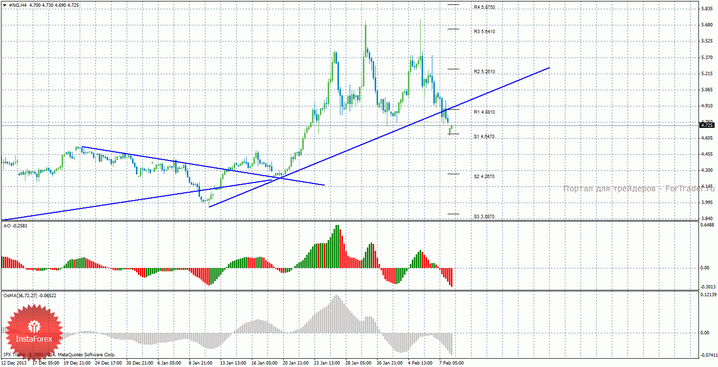 Анализ природного газа за 10 февраля показывает, что цена продолжает нисходящее движение и закрепилась ниже восходящей линии тренда, отработав уровень поддержки S1. На данный момент актуально нисходящее движение с целями уровни поддержки S2 — 4,2670 и S3 – 3,8870, если цена закрепится ниже уровня 4,6470. Целями для возможного начала восходящей коррекции выступают уровни сопротивления 4,8810 и 5,2610. Восходящая линия тренда больше не оказывает поддержку торгующим на повышение, цена закрепилась ниже нее, тенденция на рынке поменялась на нисходящую. Индикатор Awesome показывает локальное нисходящее движение, последний закрытый бар окрашен в красный цвет. OsMA также направлен вниз, что сигнализирует о нисходящем движении цены на газ и в более долгосрочной перспективе. Отскок цены от уровня 4,6470 может спровоцировать виток коррекционного движения.