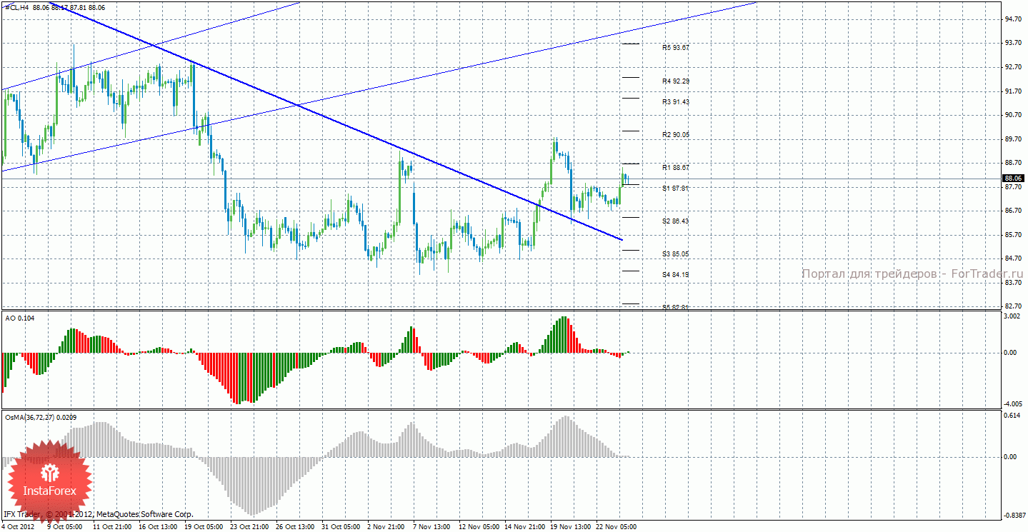 Анализ сырой нефти за 26 ноября показывает, что цена в начале недели находится между уровнями R1 и S1, что обозначает неопределенность с направлением торгов на этой неделе. Нисходящая линия тренда более не поддерживает медведей и не актуальна, а новую восходящую линию тренда пока что нельзя построить. Таким образом, актуальны длинные позиции с целями R2 – 90,05 и R3 – 91,43, но для возможности их рассмотрения требуется закрепление выше уровня 88,07. Также возможно начало нового коррекционного движения с целями 86,43 и 85,05. Индикатор Awesome показывает текущее восходящее движение, так как последний закрытый бар зеленого цвета. OsMA же направлен вниз, что говорит о нисходящем характере движения в более долгосрочном плане.