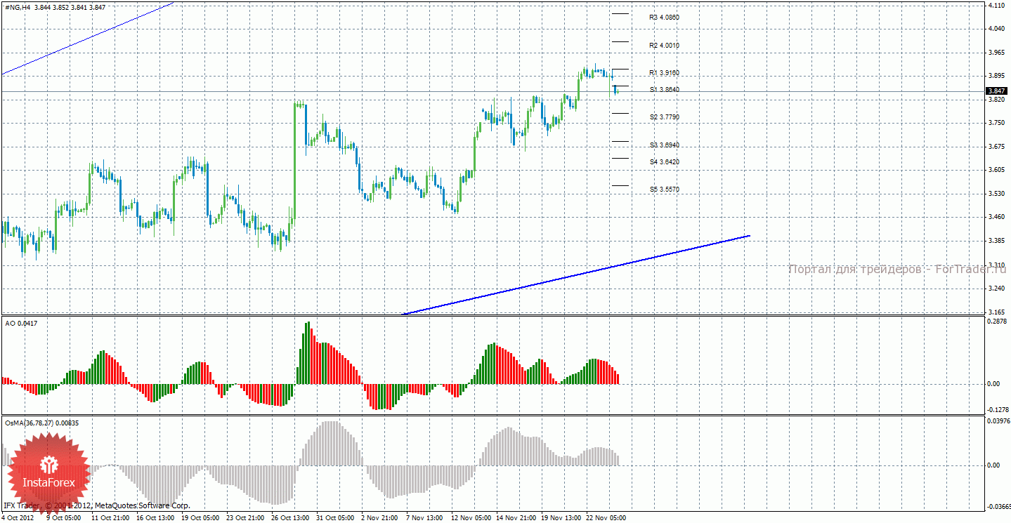 Анализ природного газа за 26 ноября показывает, что цена закрепилась ниже уровня S1, поэтому может начать новую нисходящую коррекцию, о которой свидетельствуют и индикаторы. Cейчас актуально восходящее движение с целями 3,9160 и 4,0010, но рассматривать такое движение можно будет после окончания коррекции и закрепления выше 3,8640. Целями пока что для коррекции выступают уровни 3,7790 и 3,6940. Восходящая линия тренда по-прежнему поддерживает торгующих на повышение, у нее достаточно малый угол наклона и цена довольно далеко от нее находится, однако, но и слабой ее по-прежнему назвать нельзя. Индикатор Awesome показывает локальное нисходящее движение, последний закрытый бар окрашен в красный цвет, что говорит о начале коррекции. OsMA также развернулся вниз, что сигнализирует о нисходящем движении цены на газ и в более долгосрочной перспективе.