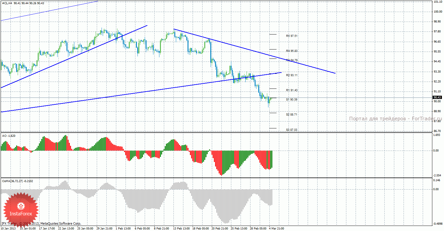 Анализ сырой нефти за 5 марта показывает, что цена продолжает нисходящее движение и закрепилась ниже уровня поддержки S1 – 90,39, поэтому нисходящее движение может продолжиться. Обе восходящие линии тренда более не поддерживают цену. Новая нисходящая линия тренда поддерживает торгующих на понижение, но цена располагается довольно далеко от нее. Таким образом, сейчас актуальны короткие позиции с целями S2 – 88,71 и S3 – 87,03, если цена останется ниже уровня 90,39. Также возможно начало восходящего коррекционного восходящего движения с целями 91,43 и 93,11, если цена закрепится выше уровня 90,39. Индикатор Awesome показывает текущее восходящее движение, так как последний закрытый бар красного цвета, что говорит в пользу возможного начала коррекции. OsMA также развернулся наверх, что говорит о восходящем характере движения и в более долгосрочном плане. Если цена закрепится выше уровня 90,39, то может начаться восходящее коррекционное движение.