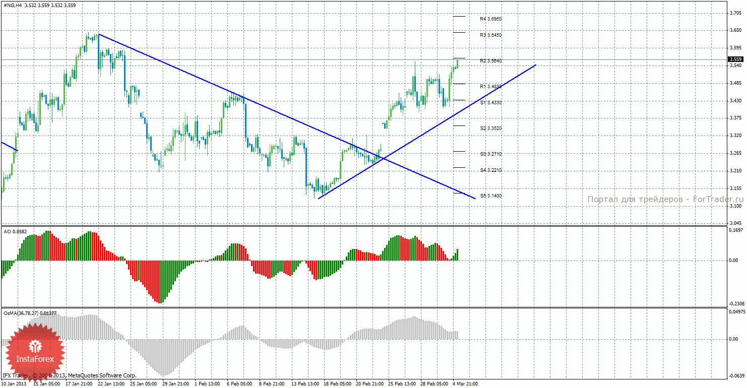 Анализ природного газа за 5 марта показывает, что цена возобновила восходящее движение, закрепилась выше уровня сопротивления 3,4830 и отработала уровень 3,5640. Сейчас актуально восходящее движение с целями 3,5640 и 3,6450. Целями для возможной нисходящей коррекции выступают уровни 3,4830 и 3,4330, если цена отскочит от уровня 3,5640. Нисходящая линия тренда больше не поддерживает медведей, а новая восходящая линия тренда оказывает поддержку быкам. Индикатор Awesome показывает локальное восходящее движение, последний закрытый бар окрашен в зеленый цвет, что говорит в пользу продолжения восходящего движения. OsMA также развернулся наверх, что сигнализирует о восходящем движении цены на газ и в более долгосрочной перспективе. Отскок цены от уровня 3,5640 может спровоцировать начало коррекционного движения, а преодоление этого уровня – продолжение восходящего тренда.