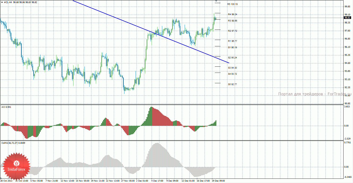 Анализ сырой нефти за 20 декабря показывает, что цена продолжает восходящее движение и закрепилась выше уровня сопротивления R3 – 98,66. Восходящее движение может продолжиться с целями R4 – 99,24 и R5 – 100,19, если цена останется выше уровня 98,66. Может начаться новая нисходящая коррекция с целями 97,72 и 96,77, в случае, если цена закрепится ниже уровня 98,66. Нисходящая линия тренда больше не оказывает поддержку торгующим на понижение, так как цена закрепилась выше нее. Новой восходящей линии тренда пока что нет. Индикатор Awesome показывает текущее восходящее движение, так как последний закрытый бар зеленого цвета. OsMA также направлен вверх, что говорит о восходящем характере движения и в более долгосрочном плане. Если цена закрепится ниже уровня 98,66, это может спровоцировать виток коррекционного движения.