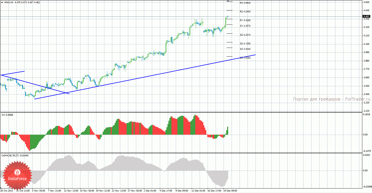 Анализ природного газа за 20 декабря показывает, что цена возобновила восходящее движение и преодолела уровни S1 и R1, оба индикатора направлены сейчас наверх. На данный момент актуально восходящее движение с целями уровни сопротивления R2 — 4,5450 и R3 – 4,6600, если цена останется выше уровня 4,4290. Целями для возможного начала нисходящей коррекции выступают уровни поддержки 4,3570 и 4,2410, если цена закрепится ниже уровня 4,4290. Восходящая линия тренда оказывает поддержку торгующим на повышение, ниже нее цена закрепиться пока не смогла. Индикатор Awesome показывает локальное восходящее движение, последний закрытый бар окрашен в зеленый цвет. OsMA также направлен вверх, что сигнализирует о восходящем движении цены на газ и в более долгосрочной перспективе. Если цена закрепится ниже уровня 4,4290, это может засвидетельствовать виток коррекции.