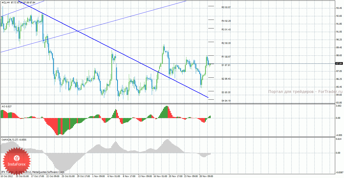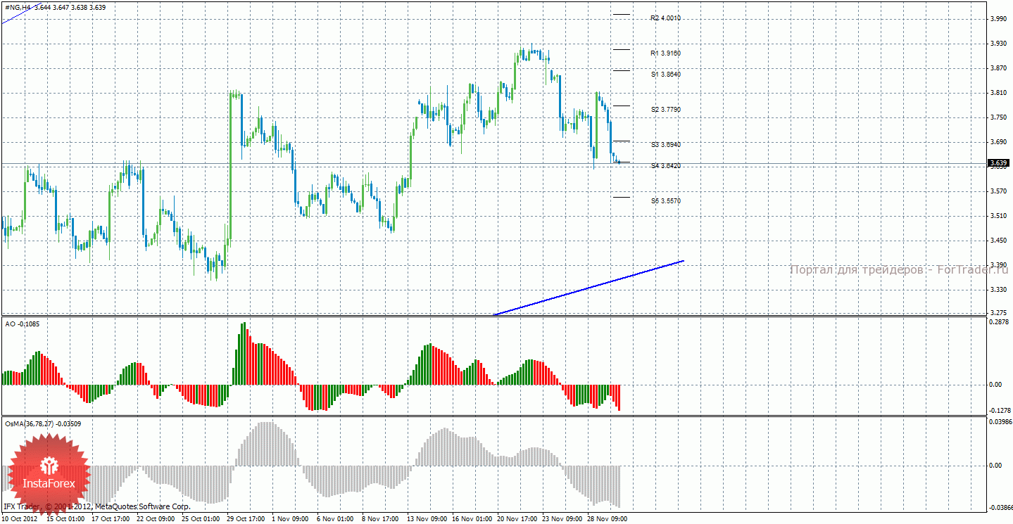 Анализ природного газа за 30 ноября показывает, что цена закрепилась ниже уровня S3, что говорит о продолжении нисходящей коррекции, о которой свидетельствуют сейчас и индикаторы. Cейчас актуально восходящее движение с целями 3,6940 и 3,7790, но рассматривать такое движение можно будет после окончания коррекции и отскока цены от 3,6420. Целями пока что для коррекции выступают уровни 3,6420 и 3,5570. Восходящая линия тренда по-прежнему поддерживает торгующих на повышение, у нее достаточно малый угол наклона и цена довольно далеко от нее находится, однако, и слабой ее по-прежнему назвать нельзя. Индикатор Awesome показывает локальное нисходящее движение, последний закрытый бар окрашен в красный цвет, что говорит о продолжающейся коррекции. OsMA также направлен вниз, что сигнализирует о нисходящем движении цены на газ и в более долгосрочной перспективе.