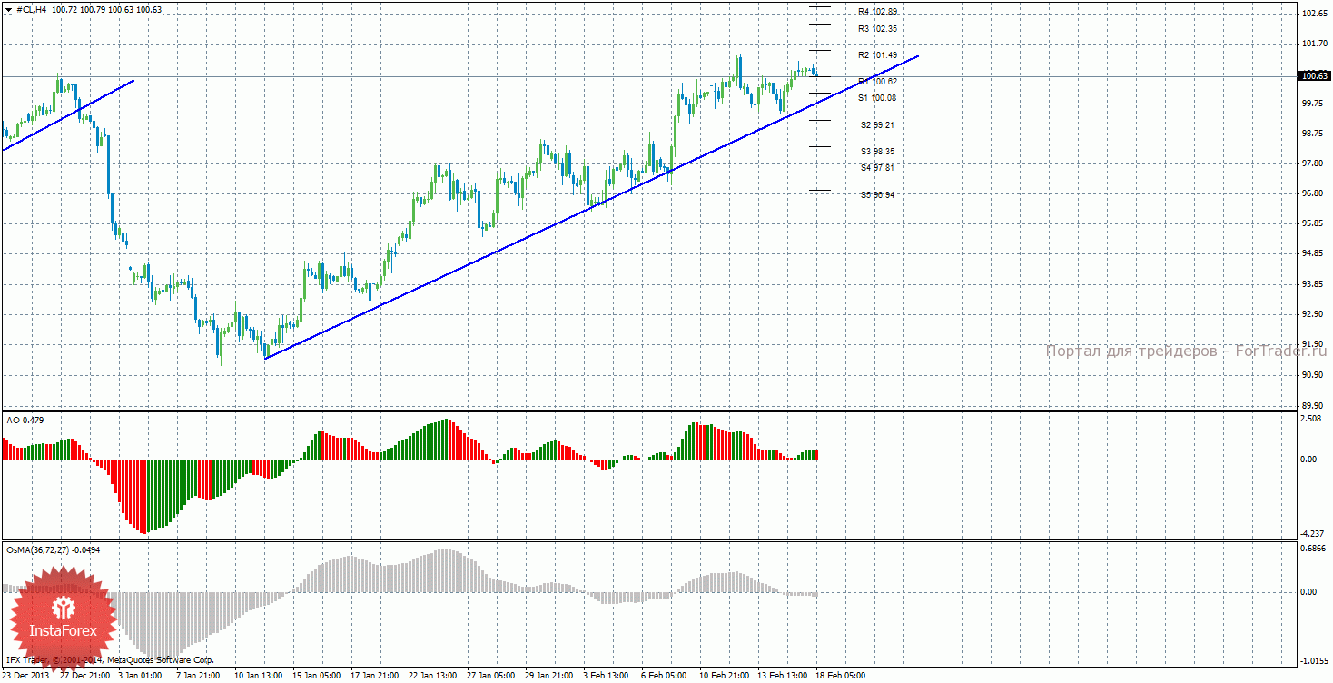 Анализ сырой нефти за 18 февраля показывает, что цена преодолела уровень сопротивления 100,62 и может продолжить восходящий тренд. Восходящее движение может продолжиться с целями R2 – 101,49 и R3 – 102,35, если цена останется выше уровня 100,62. Может начаться нисходящее движение с целями 100,08 и 99,21, в случае если цена закрепится ниже уровня 100,62. Восходящая линия тренда вновь оказывает поддержку торгующим на повышение, цена располагается выше нее. Если цена закрепится ниже линии тренда, то тенденция на рынке поменяется на нисходящую и станут актуальными короткие позиции. Индикатор Awesome показывает текущее восходящее движение, так как последний закрытый бар зеленого цвета. OsMA направлен вниз, что говорит о нисходящем характере движения в более долгосрочном плане. Отскок от уровня 101,49 может спровоцировать новый виток коррекции.