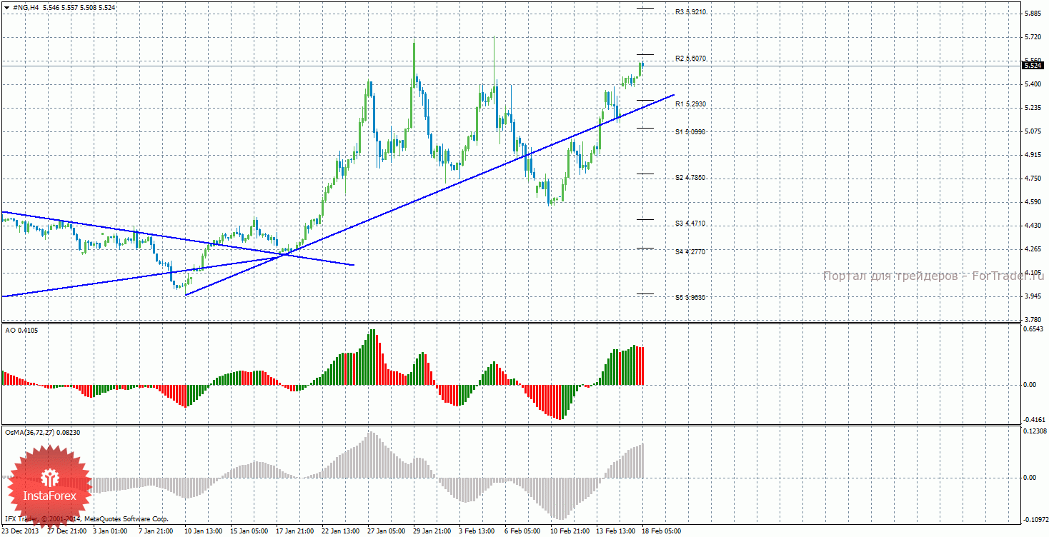 Анализ природного газа за 18 февраля показывает, что цена продолжает восходящую коррекцию и почти отработала уровень сопротивления 5,6070. На данный момент актуально нисходящее движение с целями уровни поддержки S1 — 5,0990 и S2 – 4,7850, если цена закрепится ниже уровня 5,2930. Целями для возможного продолжения восходящего движения выступают уровни сопротивления 5,6070 и 5,9210, если цена останется выше уровня 5,2930. Восходящая линия тренда больше не оказывает поддержку торгующим на повышение, цена закрепилась ниже нее, тенденция на рынке поменялась на нисходящую, но пока что она очень не устойчивая и может смениться обратно на восходящую. Индикатор Awesome показывает локальное нисходящее движение, последний закрытый бар окрашен в красный цвет. OsMA же направлен вверх, что сигнализирует о восходящем движении цены на газ в более долгосрочной перспективе. Если цена отскочит от уровня 5,6070, это может спровоцировать возобновление нисходящего движения или виток нисходящей коррекции.