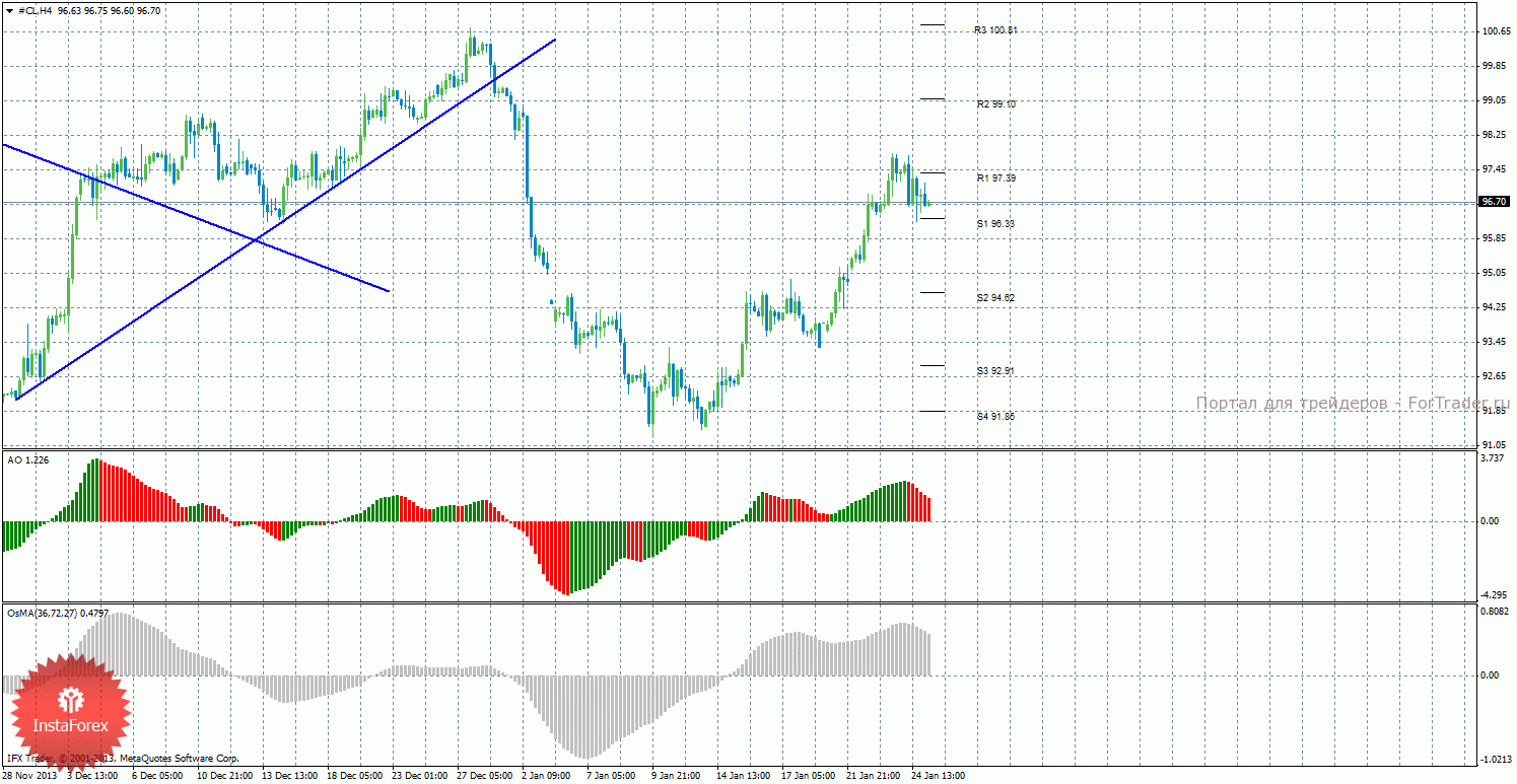 Анализ сырой нефти за 27 января показывает, что цена в начале новой недели находится между уровнями S1 и R1 и не определилась с направлением движения. Нисходящее движение может возобновиться с целями S2 – 94,62 и S3 – 92,91, если цена закрепится ниже уровня 96,33. Может продолжиться восходящая коррекция с целями 99,10 и 100,81 в случае, если цена закрепится выше уровня 97,39. Восходящая линия тренда больше не оказывает поддержку торгующим на повышение, цена закрепилась ниже нее, а тенденция на рынке поменялась на нисходящую. Нисходящей линии тренда пока что нет. Индикатор Awesome показывает текущее нисходящее движение, так как последний закрытый бар красного цвета. OsMA также развернулся вниз, что говорит о нисходящем характере движения и в более долгосрочном плане.