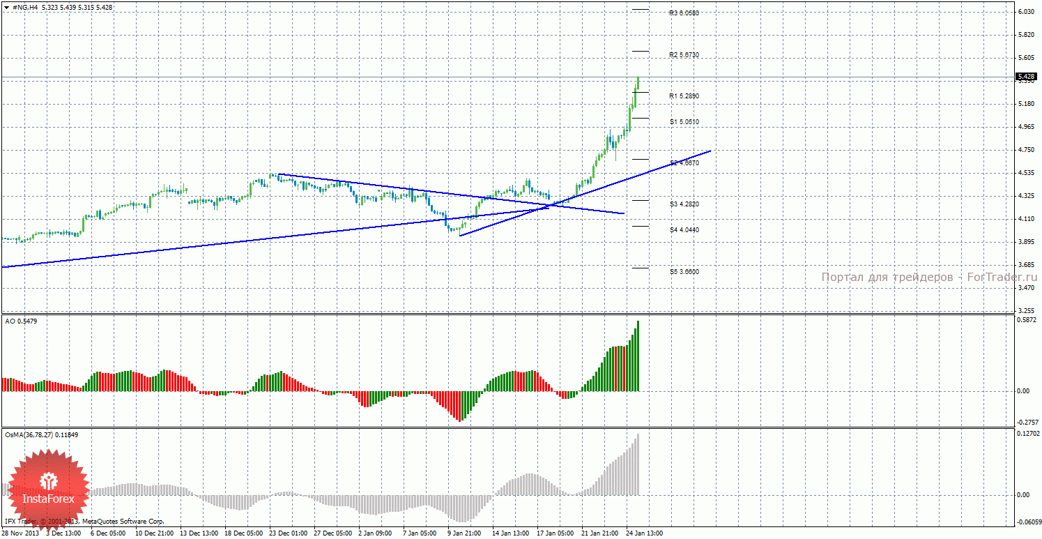 Анализ природного газа за 27 января показывает, что цена продолжает сильное восходящее движение и преодолела очередной уровень сопротивления 5,2890. На данный момент актуально восходящее движение с целями уровни сопротивления R2 — 5,6730 и R3 – 6,0580, если цена останется выше уровня 5,2890. Целями для возможного начала нисходящей коррекции выступают уровни поддержки 5,0510 и 4,6670, если цена закрепится ниже уровня 5,2890. Построена восходящая линия тренда, которая оказывает поддержку торгующим на повышение. Индикатор Awesome показывает локальное восходящее движение, последний закрытый бар окрашен в зеленый цвет. OsMA также направлен вверх, что сигнализирует о восходящем движении цены на газ и в более долгосрочной перспективе. Если цена отскочит от уровня 5,6730, это может спровоцировать виток нисходящей коррекции.