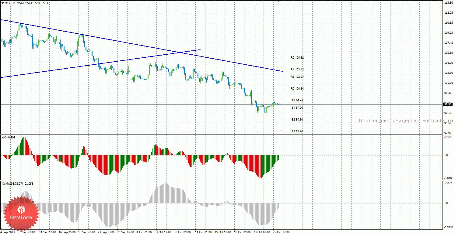 Анализ сырой нефти за 28 октября показывает, что цена продолжает виток восходящей коррекции и находится в начале новой недели между уровнями S1 и R1. Нисходящее движение может возобновиться с целями S2 – 95,36 и S3 – 93,46, если цена закрепится ниже уровня 97,26. Может продолжиться восходящая коррекция с целями 98,44 и 100,34, в случае, если цена останется выше уровня 97,26. Нисходящая линия тренда сейчас является актуальной и оказывает поддержку торгующим на понижение. Индикатор Awesome показывает текущее восходящее движение, так как последний закрытый бар зеленого цвета. OsMA также направлен наверх, что говорит о восходящем характере движения и в более долгосрочном плане. Закрепление цены ниже уровня 97,26 может спровоцировать продолжение нисходящего тренда.