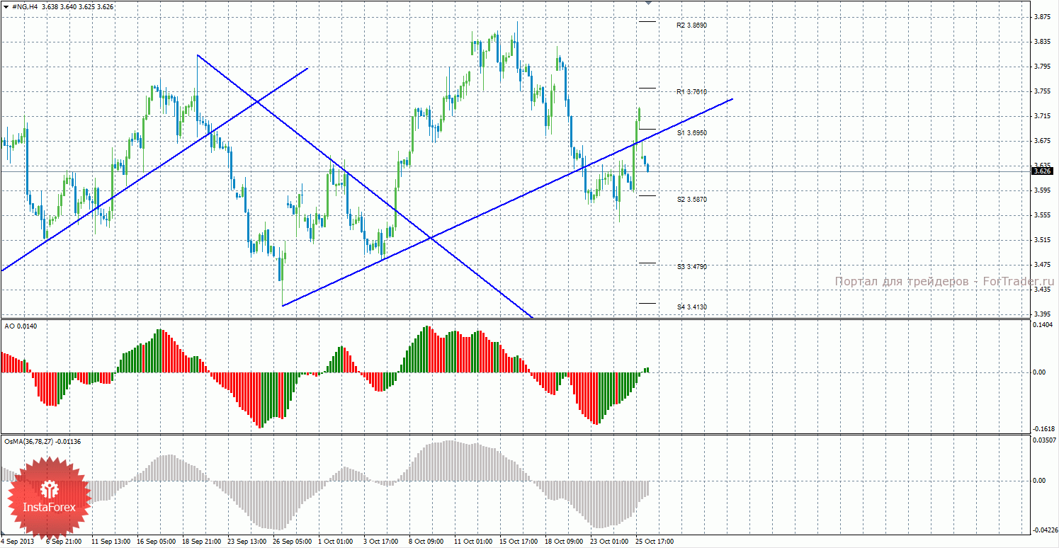 Анализ природного газа за 28 октября показывает, что цена открылась с «гэпом» вниз, поэтому восходящая коррекция скорее всего завершена, а цена может возобновить нисходящее движение. На данный момент актуально нисходящее движение с целями уровни поддержки S2 — 3,5870 и S3 – 3,4790. Целью для возможного начала витка восходящей коррекции выступают уровни 3,6950 и 3,7610, если цена отскочит от уровня 3,5870. Восходящая линия тренда больше не актуальна, так как цена преодолела ее. Индикатор Awesome показывает локальное восходящее движение, последний закрытый бар окрашен в зеленый цвет. OsMA также направлен вверх, что сигнализирует о восходящем движении цены на газ и в более долгосрочной перспективе. Оба индикатора еще не успели среагировать на «гэп». Отскок от уровня 3,5870 может спровоцировать новый виток коррекции.